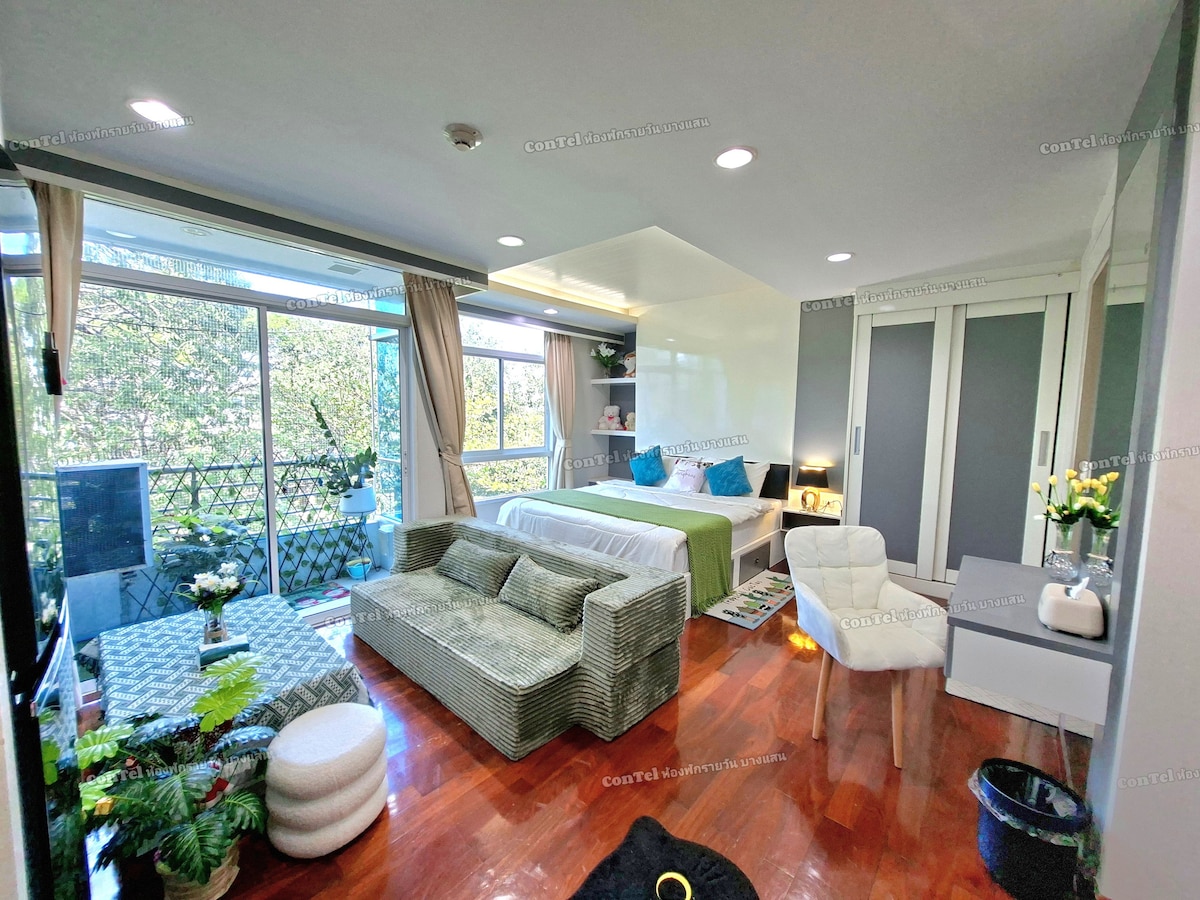 Mantenlo simple en este lugar tranquilo y céntrico. Habitación de 40 metros cuadrados adecuada para viajeros solos, trabajo remoto, estudiantes. A poca distancia a pie de la playa de Bang Sean. A 5 minutos a pie de Van a la estación de Bkk Junto al centro comercial, mercado nocturno Sat-Sun (mucha comida), 7-11, Universidad de Burapha y acuario. Aún no hay wifi Habitación: la sala de estar tiene flujo de viento, dormitorio separado con aire acondicionado. Balcón con vista a la montaña Nota: Enviar pasaporte 24 horas antes del check-in.