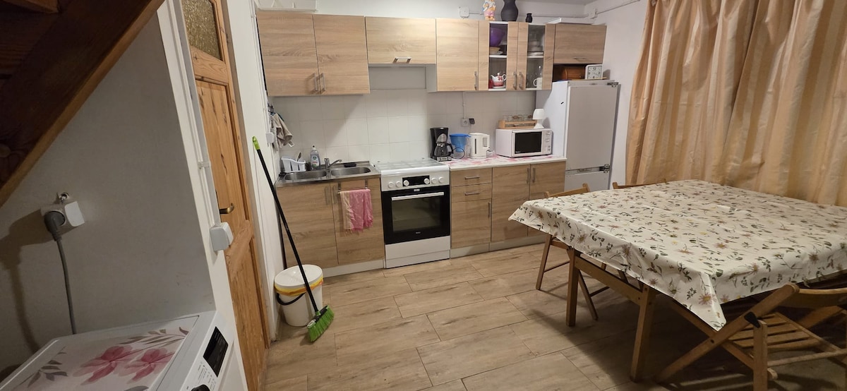 La casa de huéspedes consta de un salón principal con una cocina americana y un baño con ducha y lavabo. La cabaña está totalmente amueblada, equipada con equipos y electrodomésticos: cocina de inducción, lavadora, nevera grande, cama grande, TV, zona de estar hay un sofá. El apartamento tiene pequeños electrodomésticos de cocina: ollas, vajilla y cubiertos, sartén, hervidor de agua, plancha, estante y secadora de ropa. Hay 1 plaza de aparcamiento disponible en la propiedad.