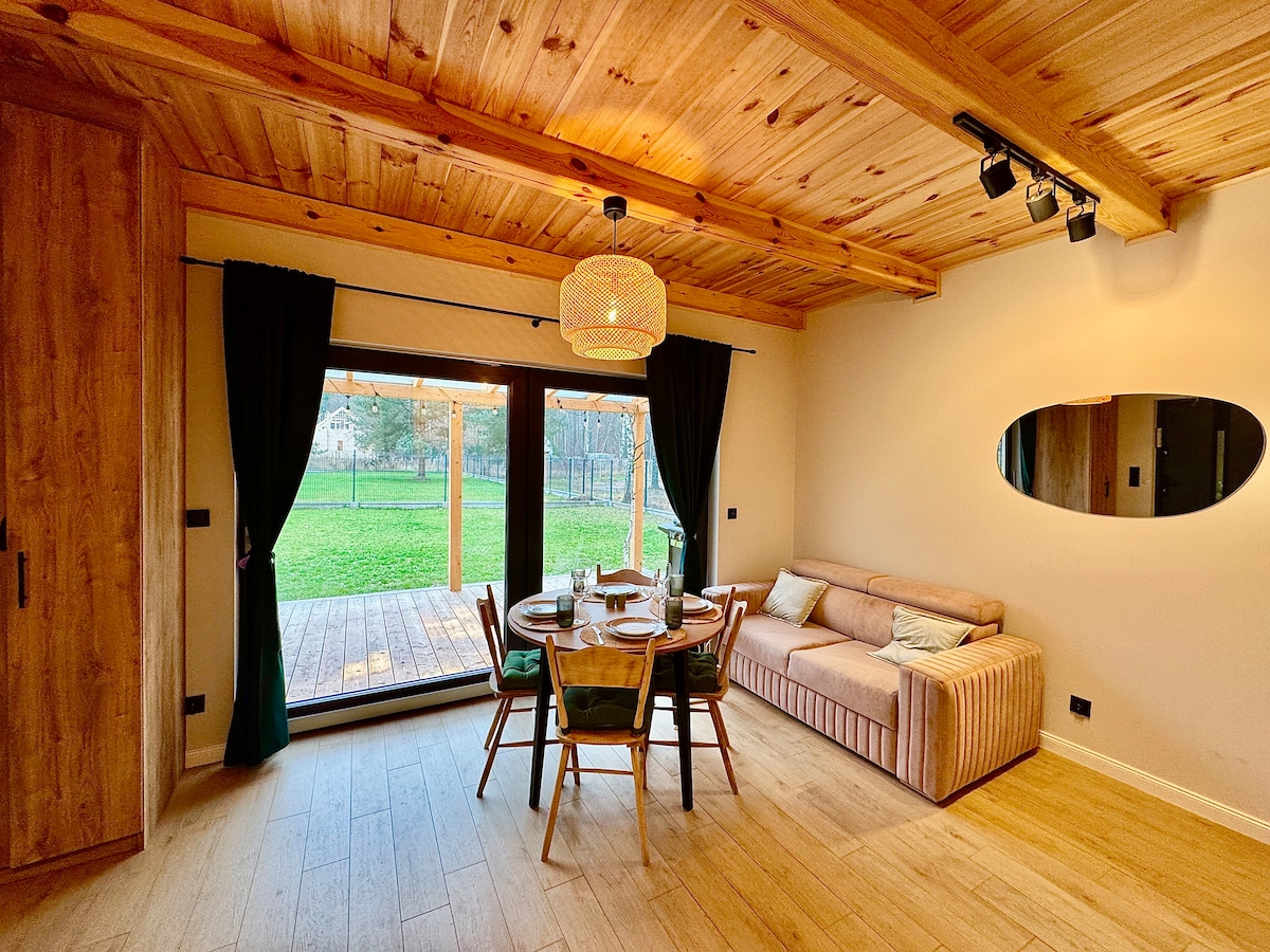Encantadora casa de madera para una familia o un grupo de amigos, situada a solo 45 kilómetros de Varsovia (muy fácil acceso). La zona tranquila hace que sea un verdadero oasis de paz. Aquí puedes respirar aire fresco, dar un largo paseo por los bosques de los alrededores o dar un paseo en bicicleta. El interior, decorado en estilo rústico, es excepcionalmente acogedor. En verano, puedes descansar en la terraza o en una hamaca, y en invierno, encender un fuego en la chimenea y jugar a juegos de mesa. ¡Se admiten mascotas! ♥