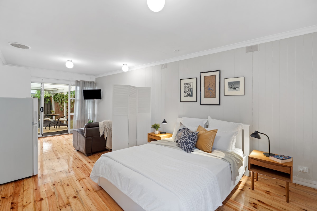 Esta casa de huéspedes recién terminada con entrada privada y sala de estar al aire libre se encuentra en el corazón de Mclaren Vale, a pocos pasos de los numerosos cafés, restaurantes y bodegas de la ciudad. Siéntate en la terraza y disfruta de una magnífica puesta de sol mientras bebes un vino local. Dos amplios dormitorios acomodarán a una familia o simplemente tendrás el alojamiento solo para ti. Una cocina completa con electrodomésticos nuevos y una cafetera hacen que sea fácil quedarse más tiempo mientras exploras las playas, rutas a pie y en bicicleta.