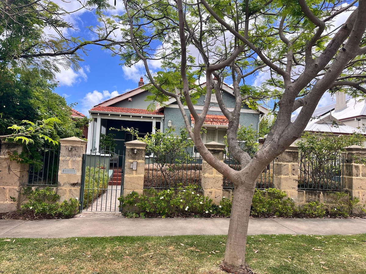 Una encantadora Federación, patrimonio, hogar de carácter a 30 segundos del hermoso Kings Park y a solo 5 minutos en autobús o coche gratuito del centro de la ciudad de Perth (o 15 minutos a pie), a 5 minutos de Subiaco y los restaurantes locales, el arte y la cultura. La casa y la ubicación son especialmente adecuadas para los visitantes por primera vez de Perth, así como para viajeros de negocios, parejas, aventureros solitarios y familias con hijos. Hay 4 dormitorios, con 5 camas en total, con capacidad para hasta 6 adultos y 2 niños o adultos individuales.