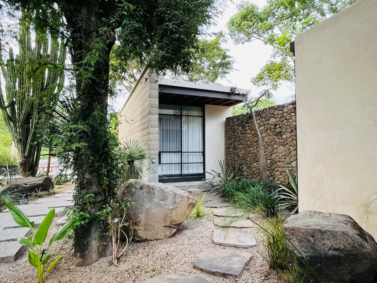 La Suite Tamarindo es una unidad independiente que cuenta con paredes de tierra compactada, un generoso baño interior/exterior, un área de trabajo, un gran armario y guardarropa, y dos camas individuales que pueden formar una cama tamaño king. Diseñamos gran parte de la propiedad para utilizar refrigeración pasiva teniendo en cuenta la sostenibilidad, por lo que la suite se mantiene fresca y cómoda. Además, tiene un ventilador de techo para mantenerla ventilada durante los meses más cálidos.