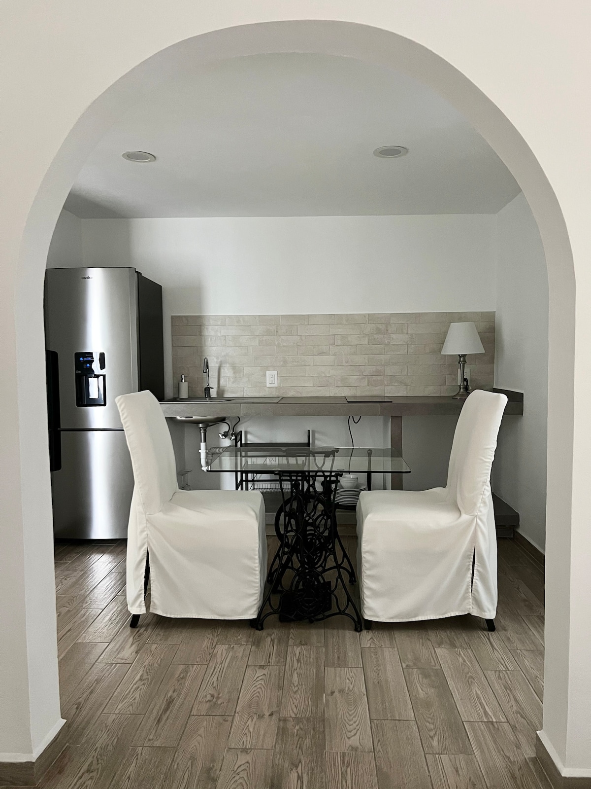 Disfruta de la sencillez de este alojamiento tranquilo y céntrico. Cuenta con 2 camas individuales y un sofá-cama matrimonial, baño y regadera nuevas, walk-in closet, barra desayunador con set de vajilla, cubiertos, cacerolas y hornilla eléctica, refrigerador, escritorio de trabajo, pantalla de 50" con Netflix, Internet, carga de USB y se proporciona un servicio de café completo que se reabastece diariamente.