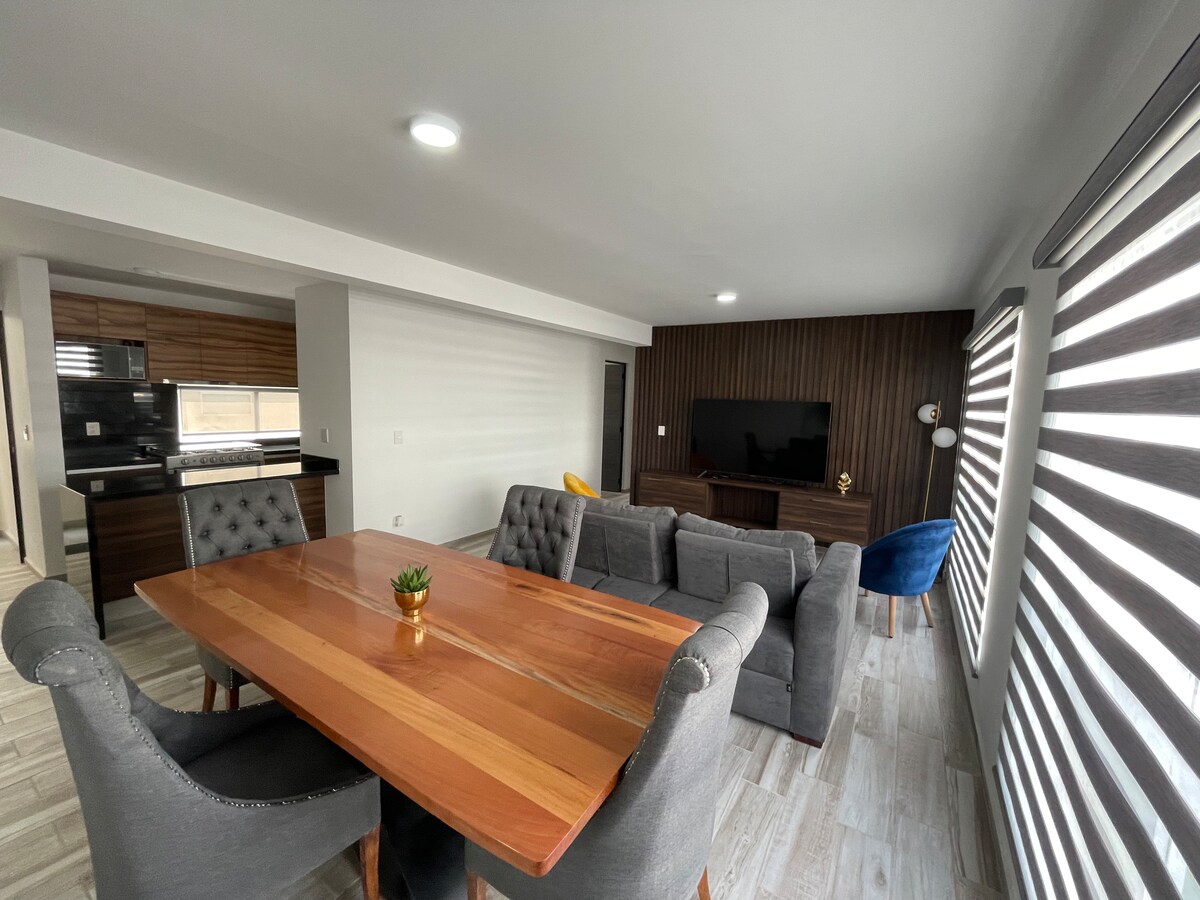 Departamento nuevo con estacionamiento y todo lo necesario para una estancia muy placentera que hará que desees regresar. La ubicación es inmejorable ya que se encuentra a unos pasos del centro comercial Mundo E y de Chedraui para que puedan disfrutar de restaurantes, cines, pista de hielo y todas las amenidades a 3 minutos caminando del departamento, wifi de alta velocidad, pantalla "55" netflix, gimnasio, ludoteca, y salón de juegos. El oxxo más cercano a 5 mtos. Plaza Satélite está a 1.5 km.