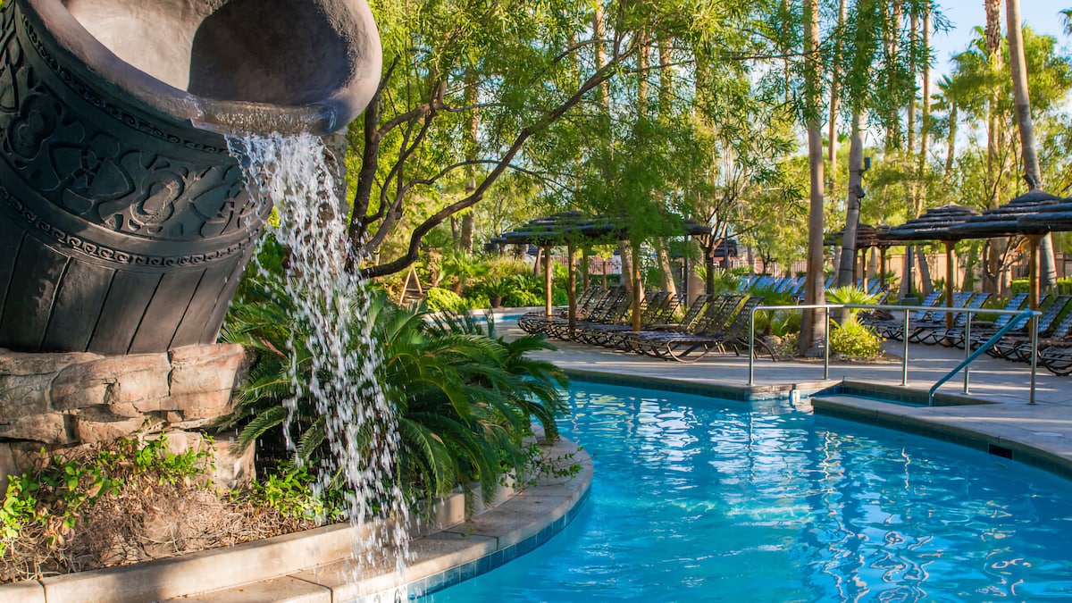 ¡Tu retiro perfecto en Las Vegas te espera! Disfruta de la comodidad en esta suite de 1 dormitorio actualizada en el galardonado Tahiti Village Resort, con capacidad para 4 personas. 🛏 Dormitorio privado con cama tamaño king 🛋 Sofá cama tamaño queen en la sala de estar 🍳 Cocina pequeña con mininevera, microondas, cafetera, licuadora. 🛁 Baño grande con bañera/ducha 🛋 Cómoda sala de estar/comedor Accede a todos los servicios del complejo, como piscina climatizada durante todo el año, jacuzzis y gimnasio. 🚫 No hay tarifas de limpieza. Sin tarifas del centro vacacional. Estacionamiento gratuito.