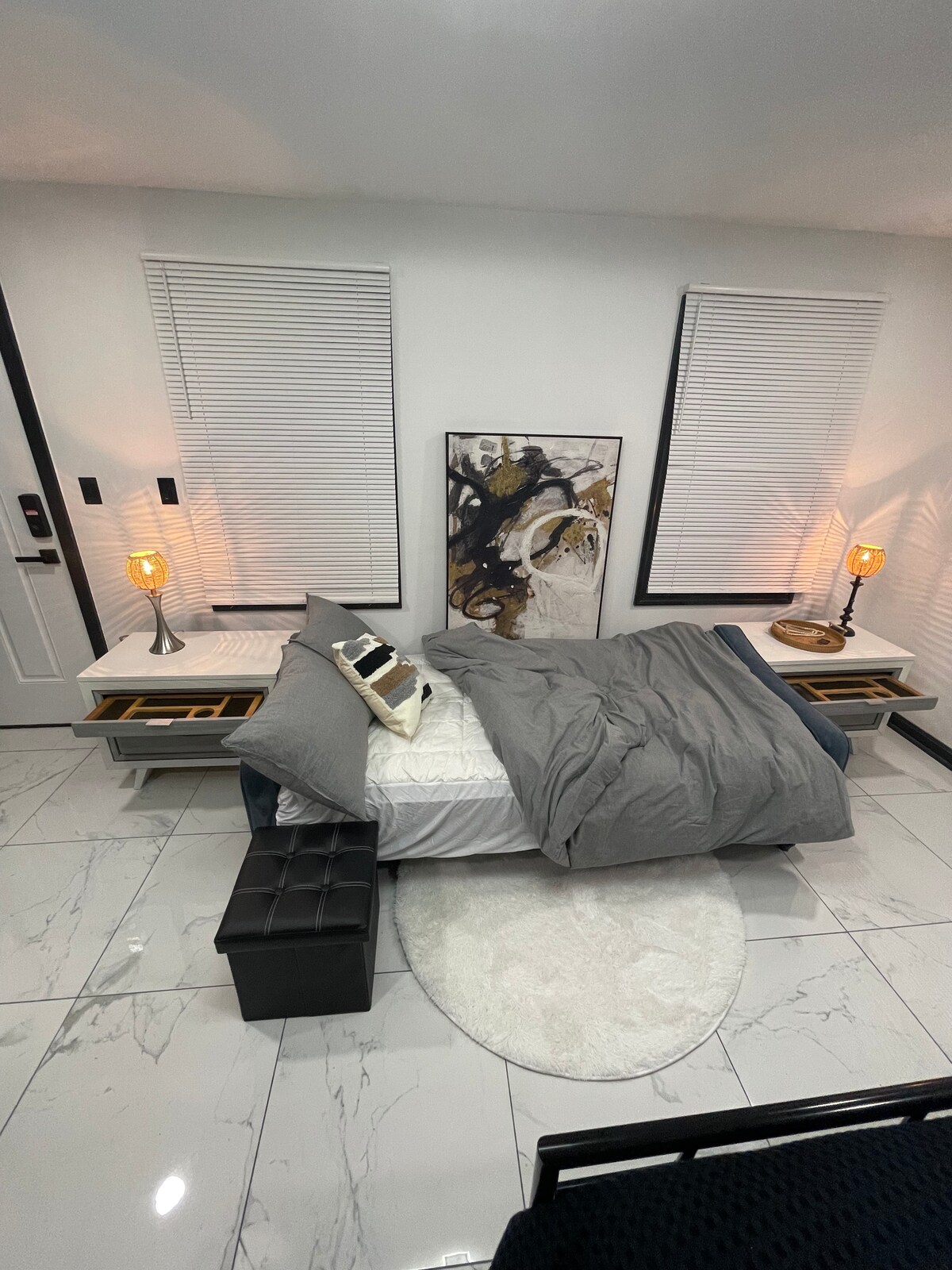 Disfruta de un refugio tranquilo y moderno diseñado para viajeros de negocios, profesionales y estancias prolongadas. El alojamiento ofrece tres camas tamaño queen con comodidad premium, un sofá y versátiles sofás cama y sillas de meditación para alojamientos compartidos. Disfruta de un baño inspirado en el spa con duchas de lluvia y de mano, elementos de piedra cargados de luz azul para un ambiente relajante, un luminoso solárium y un patio privado con una canasta de baloncesto para la recreación ligera. * Servicios públicos y limpieza mensual incluidos.