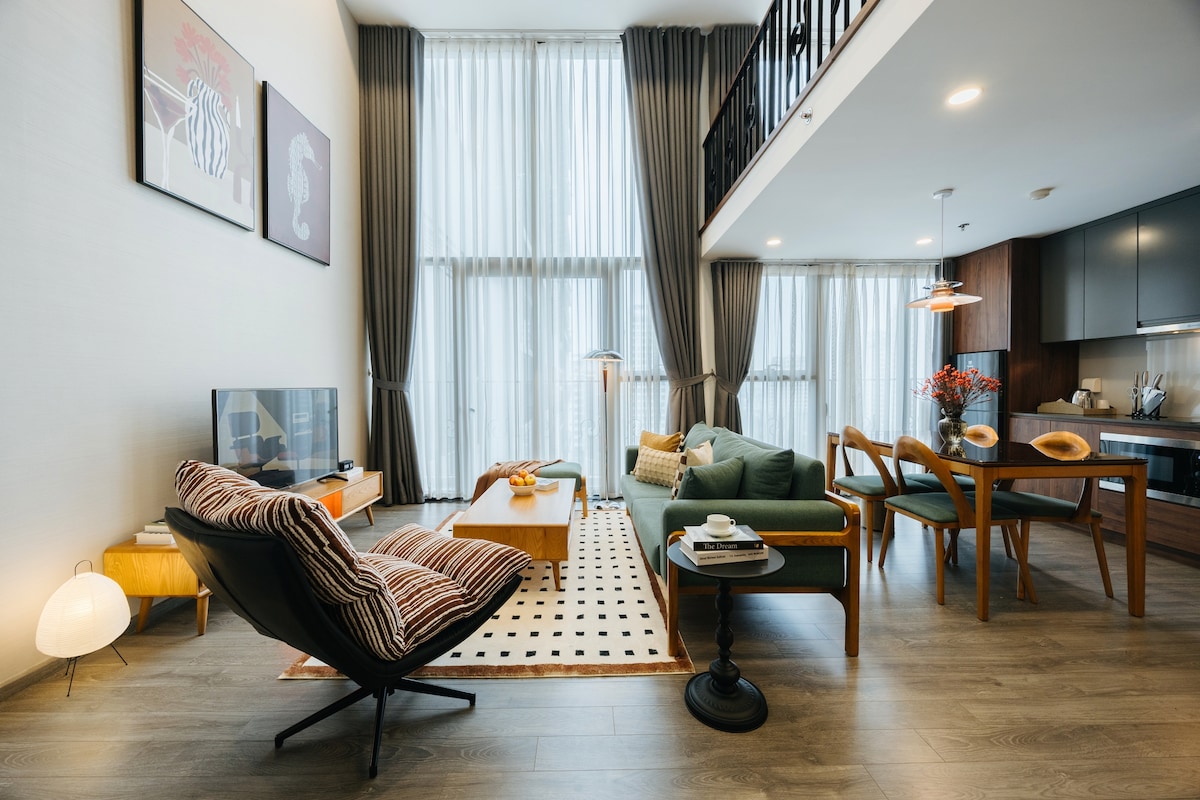 PentStudio – Luxury Living in Hanoi Welcome to Olive Loft – a sunlit mid-century duplex with soaring high ceilings and full-height windows. Designed with warm walnut wood, olive tones and retro Bauhaus accents, this space blends vintage character with modern comfort. A cozy coffee corner under the stairs and a statement armchair make it perfect for slow mornings and relaxed evenings.