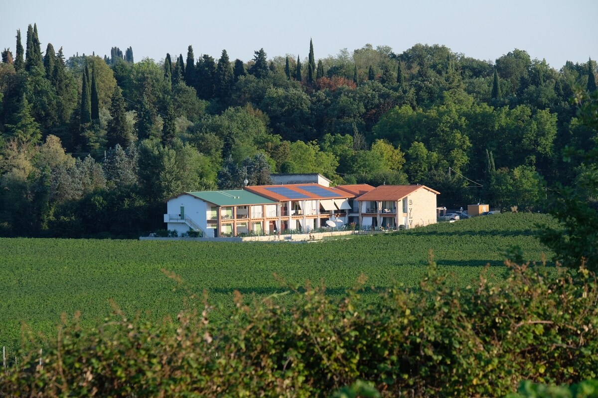 Mini Apartment in a Private Villa – Exclusive Privacy and Relaxation! The only guest unit, with no other guests, offering you complete peace and quiet. The mini apartment is part of our villa, newly built with a private entrance and high-quality finishes. Enjoy the spacious garden with views over vineyards and hills, and unwind in the jacuzzi for your exclusive use. Strategic: Lake 7 km, Safari Zoo 1 km, Colà Thermal Baths 2 km, Gardaland 4 km, Peschiera and Lazise 7km, Verona and airport 20km.