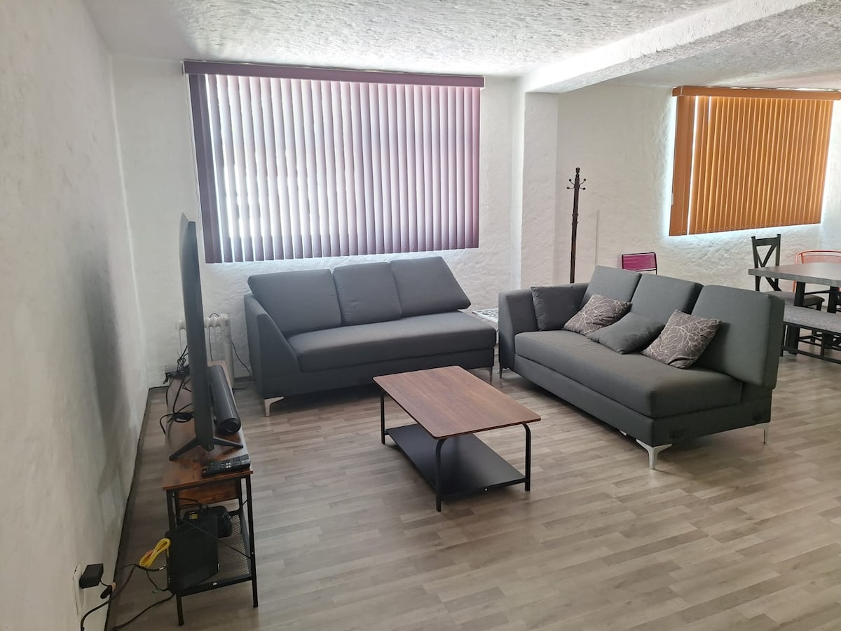 Departamento de 2 recamaras hasta para 4 personas ( recámara principal con cama queen size, recámara secundaria con 2 camas individuales); localizado al fondo de una calle cerrada, muy tranquilo; Tiene acceso a la azotea a través de la escalera de caracol. La velocidad del internet es de 40MB se puede escalar (con costo adicional) a 100, 250, 500 y 1000MB