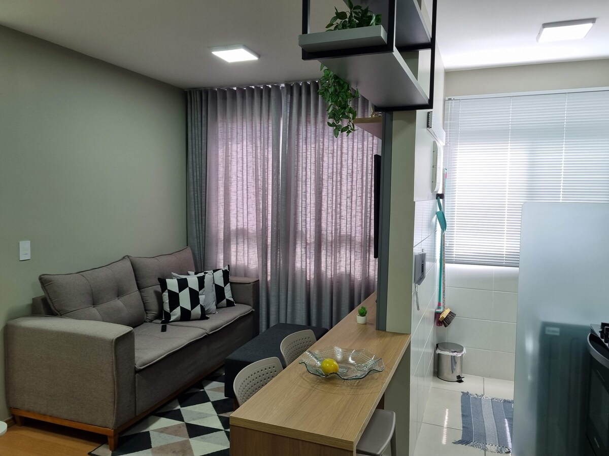 Relájate en este espacio tranquilo y con estilo. Hola, soy tu anfitriona. Vamos a conocer un poco del espacio que he dejado especialmente para ti. Espacio con un toque moderno. Completamente diseñado en un alojamiento acogedor. Cuenta con TV de 42 pulgadas, con Wi-Fi, YouTube, Netflix, Globo Play y mucho más. ¡Sofá cama para que te sientas como en casa viendo tu serie favorita! Cocina completa con todo lo necesario para preparar lo mejor, lavadora y secadora.