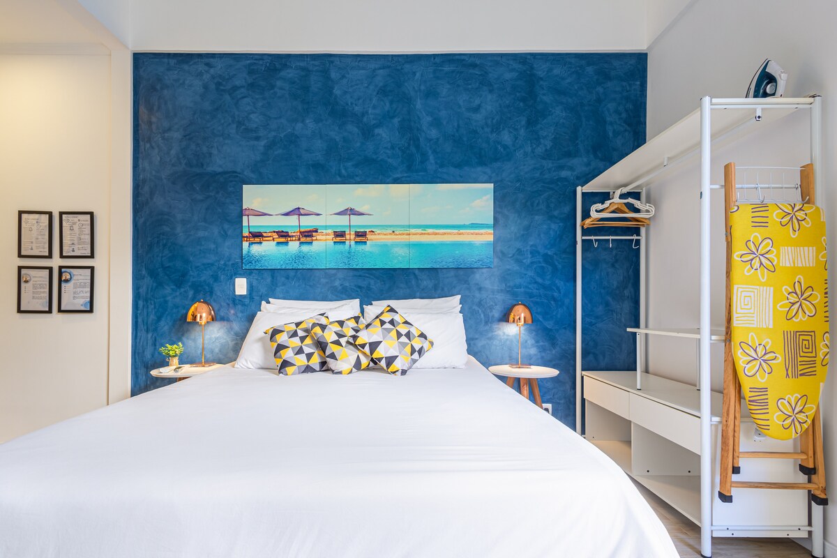 A solo unos metros de la playa de Copacabana (Posto 4) con una ubicación estratégica, cerca de los mejores restaurantes, bares y tiendas. Junto al metro (a 350 m de la estación de Siqueira Campos) ; Y todavía junto a la estación de bicicletas Itaú. El apartamento/ estudio (42 m) tiene un concepto de espacio más abierto con una decoración fresca y ligera. Con áreas comunes que fueron diseñadas para el público que buscan practicidad sin renunciar a la comodidad. Tiene vistas gratuitas y laterales al mar, es súper luminoso y espacioso.