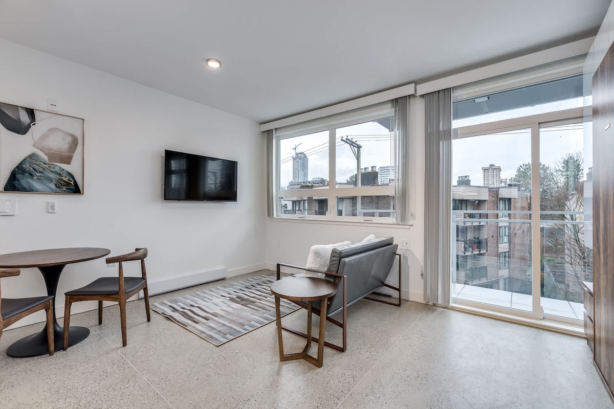 A solo 2 cuadras al sur de la playa/malecón y ferry a pie del mercado turístico de Granville Island. Multitud de restaurantes en Davie Street, a 2 cuadras al norte y a 1 km a pie hacia el norte de las famosas tiendas Robson St. Grandes ventanales en una tranquila calle bordeada de árboles. Edificio de hormigón macizo alrededor de los años 60. Jr. suite (dormitorio compacto), encimeras de cuarzo en total de aprox. 430 pies cuadrados, electrodomésticos más nuevos, lavavajillas, muebles, cama, toallas de cama, etc. Plaza de estacionamiento GRATUITA.