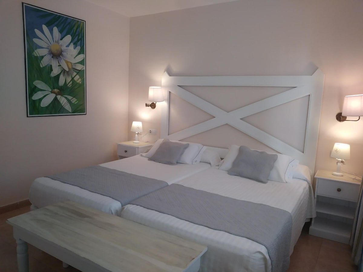 Logement de 40m2, moderne, élégant à quelques mètres de la mer et des plages de Corralejo, situé dans une zone paisible mais à la fois proches de tous les commerces et distractions de la ville. Une piscine, idéal pour te rafraîchir ou prendre un bain de soleil sans avoir à aller bien loin, ou encore un balcon vue jardin, en fait un logement UNIQUE à Corralejo . Si tu aimes les coucher de soleil il te suffira de monter sur le rooftop, profiter des orchestres avec un verre dans la main et admirer