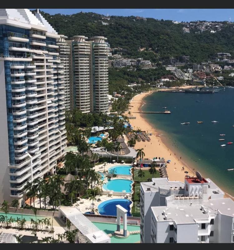 El departamento está ubicado en un piso 25 y tiene una vista privilegiada a la bahía de Acapulco. El condominio tiene 3 elevadores que permiten un arribo al departamento muy cómodo. El departamento cuenta con nueva cancelería y ventanas para huracanes.Además de tener acceso directo a la playa, el condominio cuenta con un área de uso exclusivo en ella. Hay una gran alberca sobre una terraza que mira al mar. Para nuestros huéspedes existe en la alberca servicio de camastros y sombrillas sin costo.