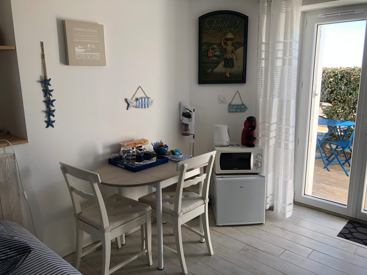 Barrio tranquilo, cerca del comercio ( 1 km) y la playa (3 km) Dependencia nueva mimos(27 m2) con acceso privado. Compuesto por un dormitorio (cama de 160*190) TV, baño con inodoro, y zona de comedor (refrigerador-congelador, fregadero, horno multifuncional, placa de inducción en el exterior, cafetera dolce gusto, etc.) jardín piscina estacionamiento, wifi .