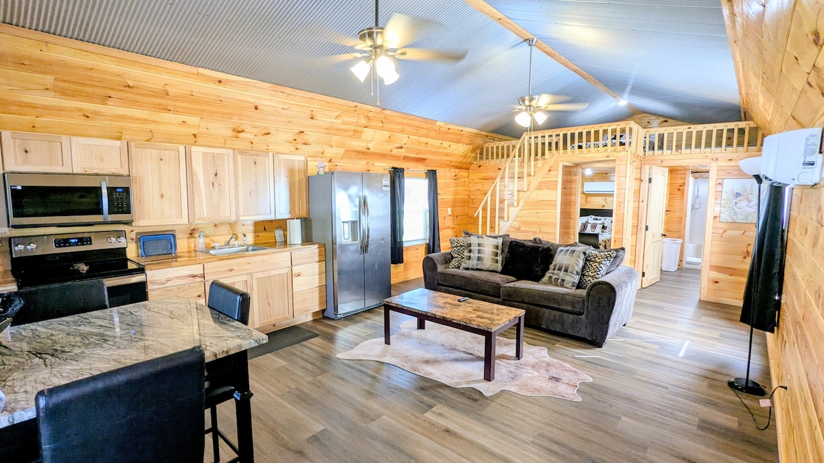Small house with 2 rooms and 2 lofts. Each room and loft has a queen bed giving plenty of sleeping room for eight people. The home is designed with an open floorplan and mix of wood and corrugated steel interior, bringing warmth and charm.