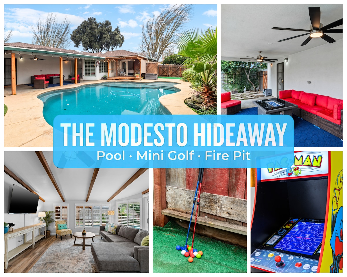 Welcome to your luxury retreat in Downtown Modesto! This fully remodeled 2BR/1.5BA Midcentury Modern home offers: • 1,150 sq ft of stylish double story home with spacious living space with new kitchen and baths • Large yard with paver-lined grass, Edison lights, and fire pit • 65” Smart TV, 1200mbps WiFi, 4K security system, and smart garage • Queen bed with desk, plus two twin beds, all with premium linens • Walking distance to fine dining, nightlife, and attractions