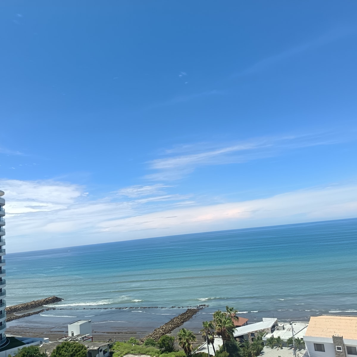Departamento en el centro de la ciudad de Manta con vista al mar. Ubicado en la primera línea al mar con acceso directo a la playa El Murciélago, a pocos metros a pie del malecón escénico, restaurantes, Mall del Pacífico y supermercados; cuenta con generador de energía, piscina climatizada, jacuzzi, gimnasio, estacionamiento, ascensor y zona de recreación para niños, el edificio es totalmente seguro y sus instalaciones son las adecuadas para pasar unas vacaciones en familia, pareja o amigos.