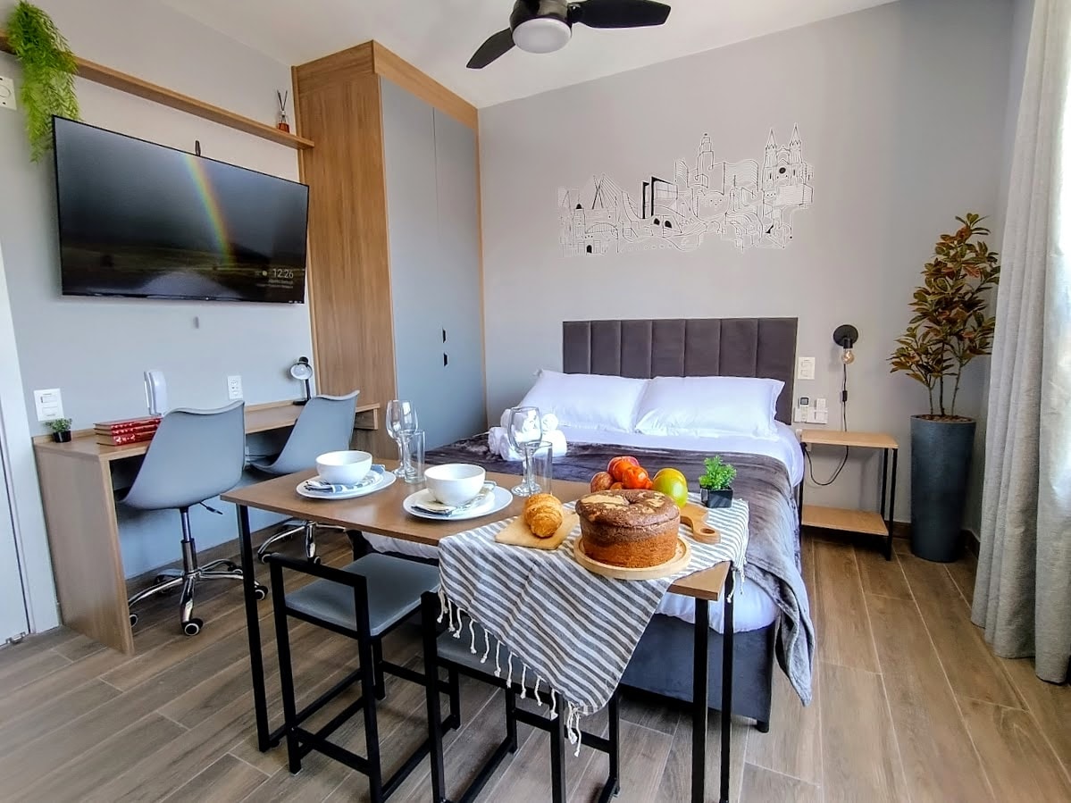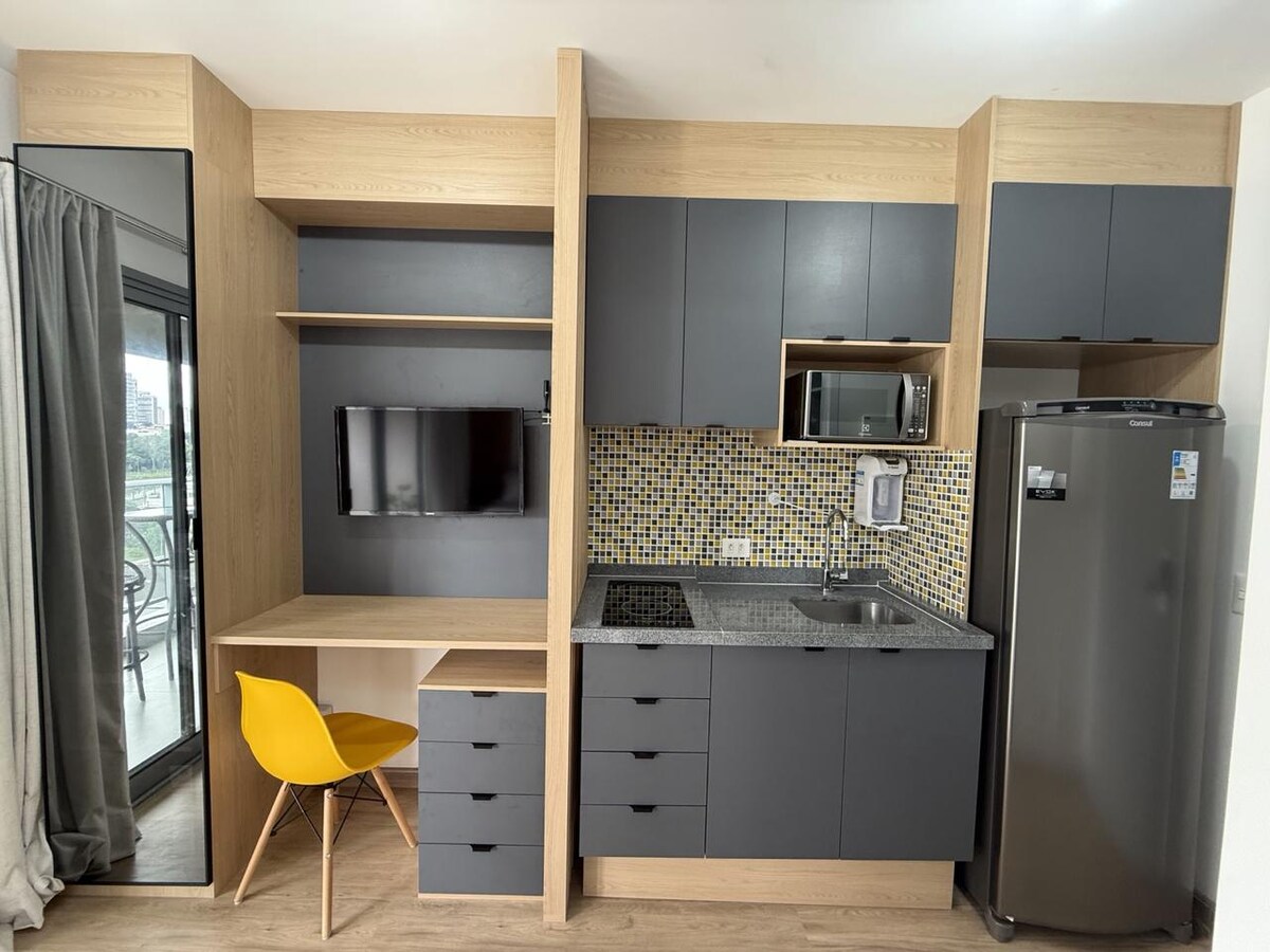 Estudio completo y bien ubicado. Ideal para trabajo o descanso. Wi-Fi rápido, Smart TV de 43", aire acondicionado y cama box súper cómoda. 250 m del metro Cocina con anafe de inducción, freidora de aire, frigobar, cafetera, sandwichera, microondas y utensilios Baño, ropa de cama y toallas incluidas Balcón encantador con espacio para comidas y silla de lectura En el edificio: piscina con vista en la terraza, gimnasio moderno y centro comercial con restaurantes, cafés y tiendas en la planta baja
