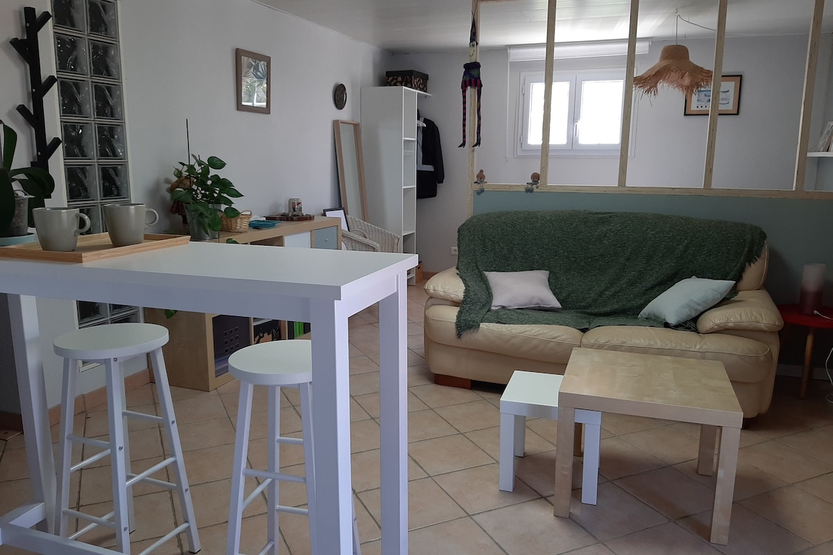 En la planta baja un gran espacio con cocina equipada, baño y aseo independiente. En la planta superior, un dormitorio con cama doble, un inodoro independiente, una segunda habitación oficina / dormitorio con un sofá cama de 2 plazas. Toda la propiedad cerrada y arbolada con estacionamiento gratuito A 3 minutos andando de la estación de tren y 8 minutos andando del centro de la ciudad. Precio para 2 personas con alojamiento completo. 10€ por cada huésped adicional. Llegada anticipada o salida tardía sujeto a un suplemento mínimo de 15€ según horario