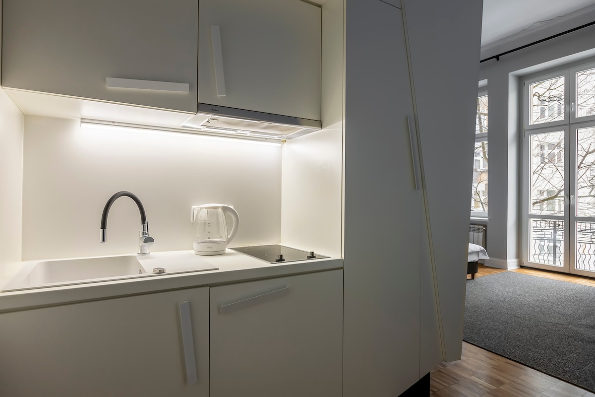 Nuevo estudio con balcón y entreplanta en una casa de vecindad revitalizada en el centro de la ciudad, justo al lado de la Universidad de las Artes. A pocos minutos del casco antiguo. Buen acceso en tranvía desde la estación principal y el aeropuerto. El edificio tiene ascensor. La casa fue el escenario de un crimen en la novela policíaca de Ryszard Ćwirlej titulada Lo tienes como en un banco.