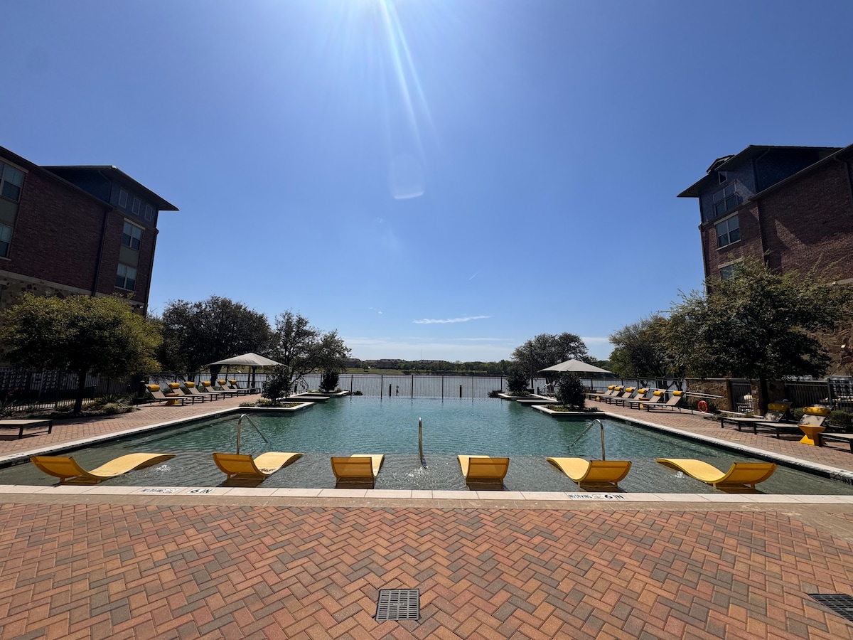 Despierta con impresionantes vistas al lago en esta moderna suite de diseño de 1 dormitorio y 1 baño en Las Colinas. * 💎 VIDA DE LUJO: suite de diseño con impresionantes vistas y balcón privado. * 🚉 APTOS PARA VIAJES: pasos para la línea naranja de DART para ir a cualquier parte de DFW * 💪 COMODIDADES: obtén acceso las 24 horas del día, los 7 días de la semana a un gimnasio de alta tecnología, piscina, salas de conferencias y sala de juegos, todo con impresionantes vistas al lago. * 💻 POTENCIA: 1 GB de fibra wifi + espacio de trabajo dedicado con configuración de monitor de 27”. * ✨ LA OFERTA: disfruta de las ventajas de un centro vacacional de 5 estrellas sin el precio