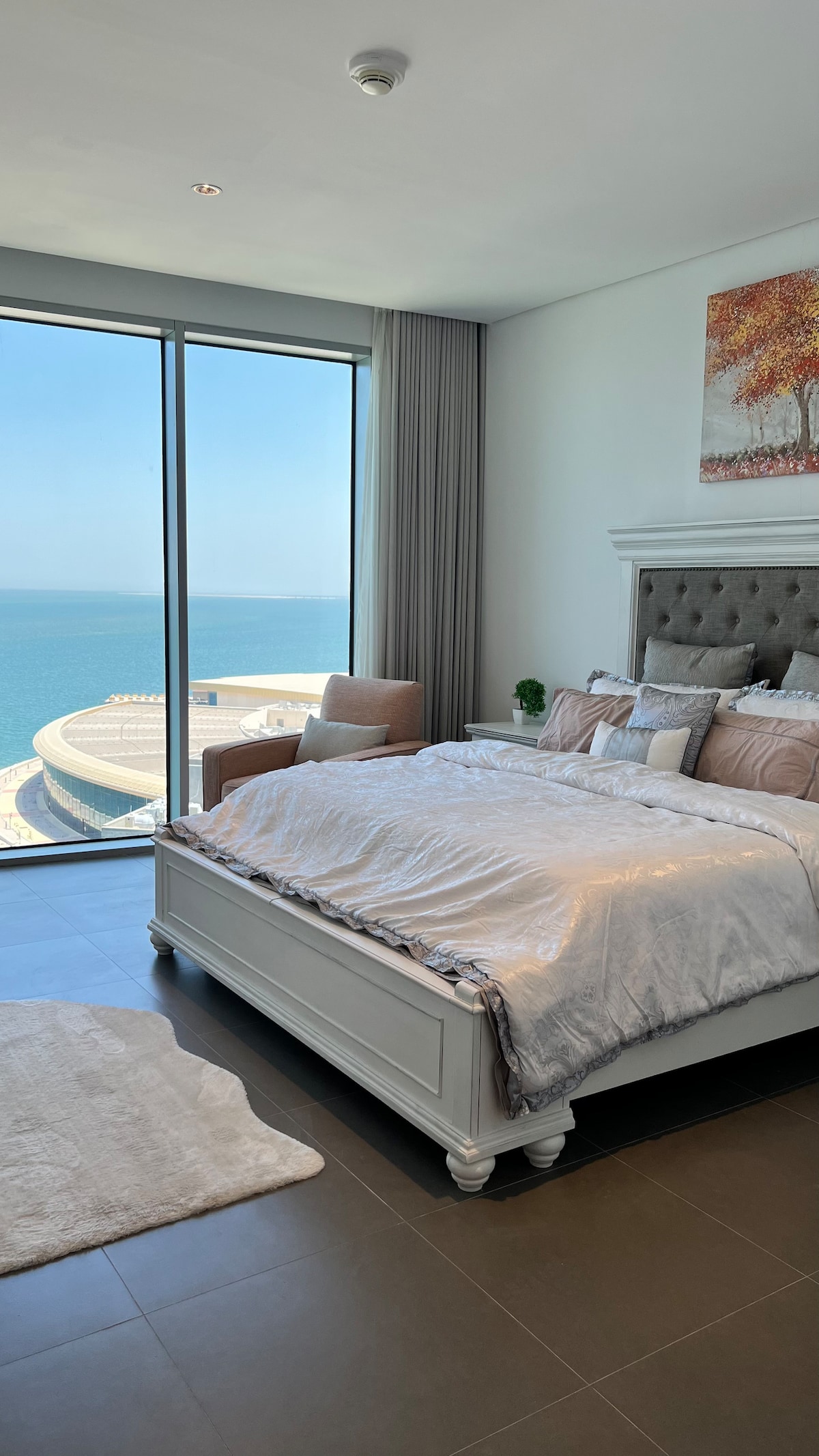 Un moderno departamento con vistas directas al mar, que te da acceso exclusivo a una playa privada y te deja a minutos del puente de Baréin. LO más destacable: • Habitaciones: tiene dos dormitorios, uno de los cuales es un dormitorio principal. • Ubicación: ubicación ideal y tranquila muy cerca del puente de Baréin, • Vista: amplio balcón con una encantadora vista panorámica al mar. • Entretenimiento: elegante sala de estar con televisor inteligente de 65 pulgadas. • Acceso flexible: función de acceso inteligente para hacer el check-in en cualquier momento con facilidad y privacidad. • Cocina y hospitalidad: una cocina totalmente equipada, con un rincón especial equipado con herramientas de café y té. • Servicios: estacionamiento privado.