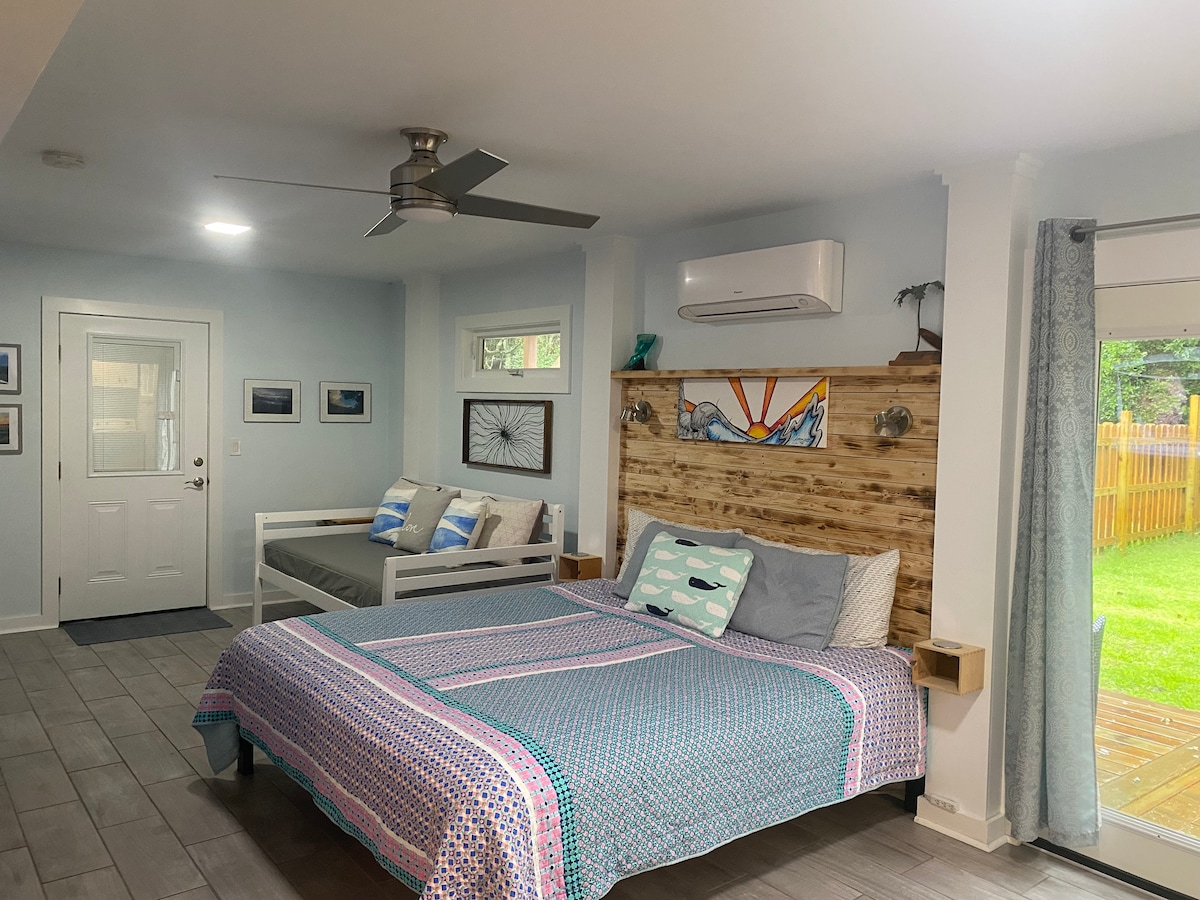 Minicasa moderna construida en 2023 ¡SUP, bañera de hidromasaje, kayaks, bicicletas, hermosas puestas de sol con vistas al Albemarle Sound! Muebles modernos y cómodos, todos nuevos en mayo de 2023. Toda la casa está separada y tiene un dormitorio, un baño completo, una sala de estar y una cocina completa. Hermoso jardín de rosas y árboles que rodean el porche. Gran energía para parejas de luna de miel u otras personas que quieran pasar tiempo de calidad juntos. A poca distancia a pie del Albemarle Sound y a 5 minutos en auto de la playa.
