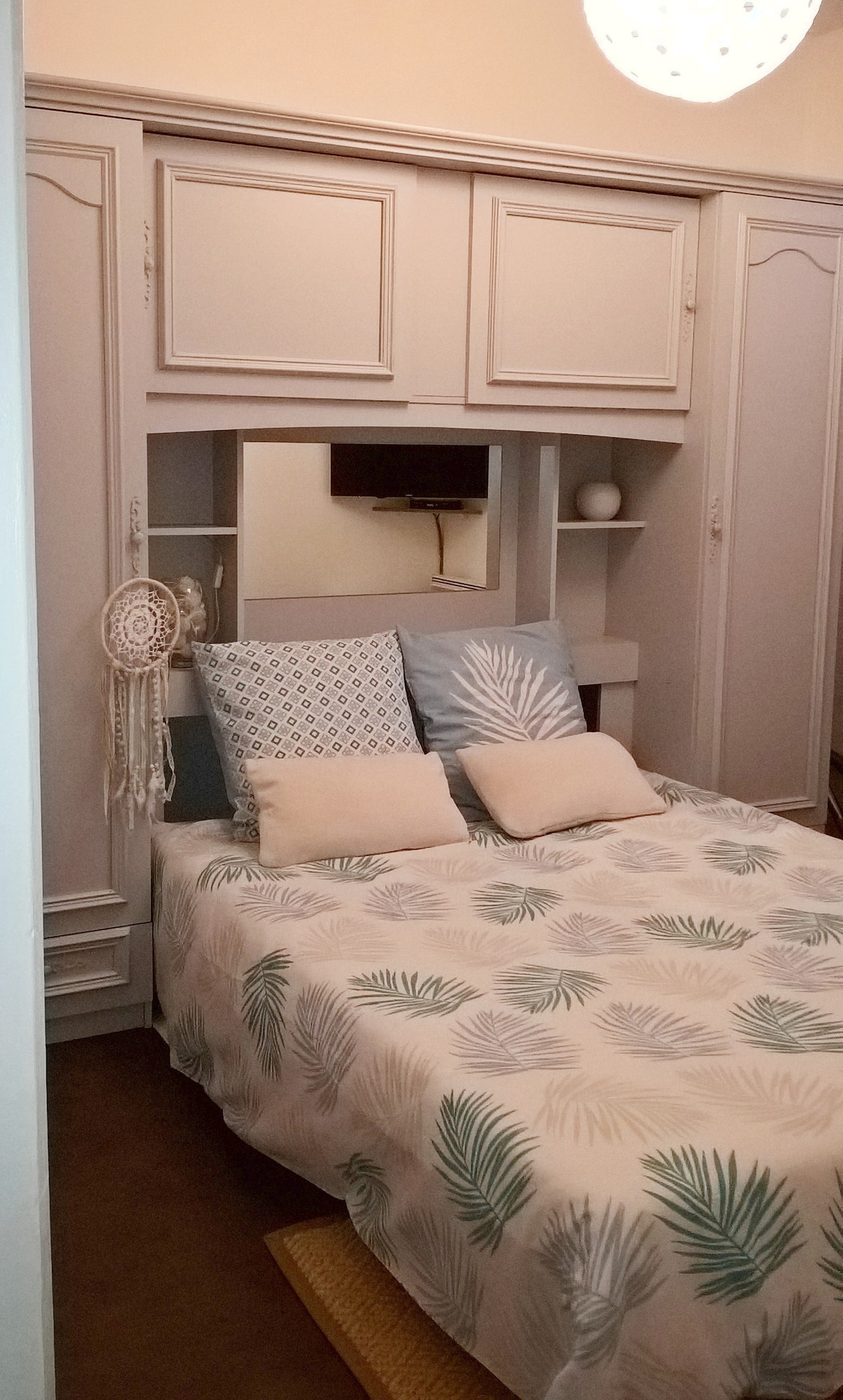 Pequeño estudio de 15 m2 equipado con una cama doble de 140 x 190, una ducha a ras de suelo, una cocina americana con nevera, un televisor. WC fuera del estudio (la puerta de al lado). Mesa plegable. Ideal para 2 personas, pero posibilidad de añadir una cuna para bebés que traerá. El estudio se encuentra en nuestro jardín con una bonita vista despejada del Vercors. Todo lo necesario «vital» a su llegada está disponible.