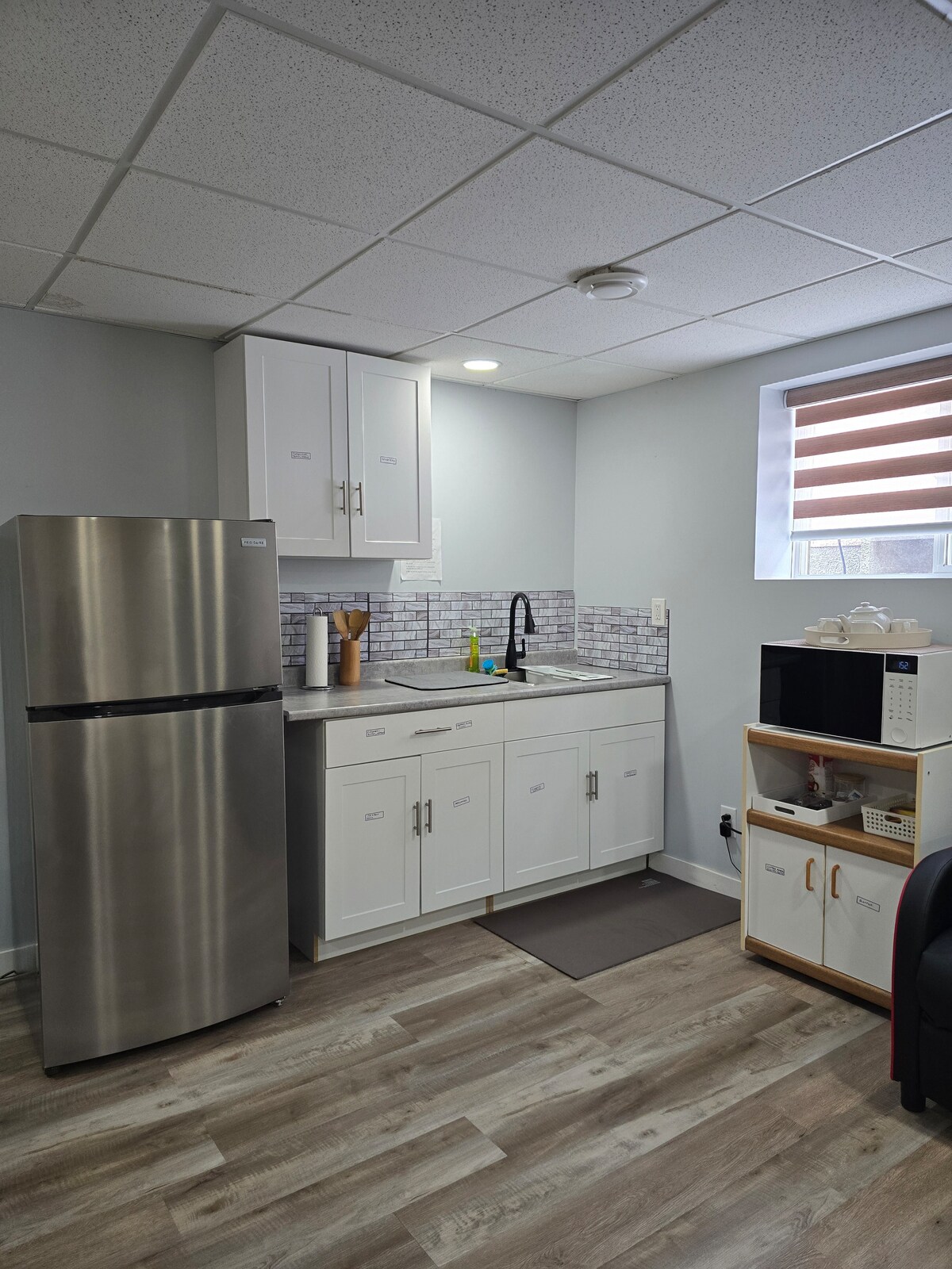 ¡Buscas un lugar de escapada, privado, silencioso y tranquilo! Apartamento de 1 dormitorio en el sótano con un lado de cocina que viene con nevera, microondas, hervidor de agua, cafetera, cubiertos y utensilios básicos para tu uso. La habitación está equipada con un escritorio y una silla de lectura ajustables, una cinta de correr para hacer ejercicio y una cama tamaño queen que es cálida y acogedora para un sueño perfecto. Se proporcionan toallas frescas y limpias. Se encuentra en un entorno sereno de la ciudad con un sistema de autobuses de tránsito funcional.