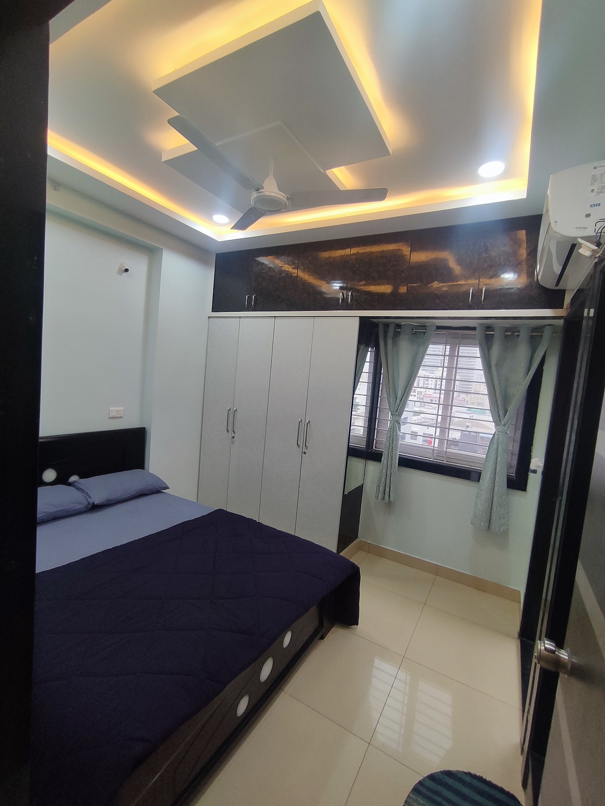 Bienvenido a nuestro elegante apartamento de 3 BHK, perfecto para estancias cortas o largas. Disfruta de 3 dormitorios con aire acondicionado y baño privado, una acogedora sala de estar con un televisor inteligente de 43 pulgadas, wifi de alta velocidad y un columpio interior. La cocina está totalmente equipada con estufa de gas, microondas, purificador RO, nevera y utensilios. Relájate en la amplia mesa de comedor o lee de nuestra colección de libros. Ubicado cerca de Hitech City Metro, Rameshwaram Cafe (100 m), US Visa Center (1 km), Cable Bridge, IT hubs,