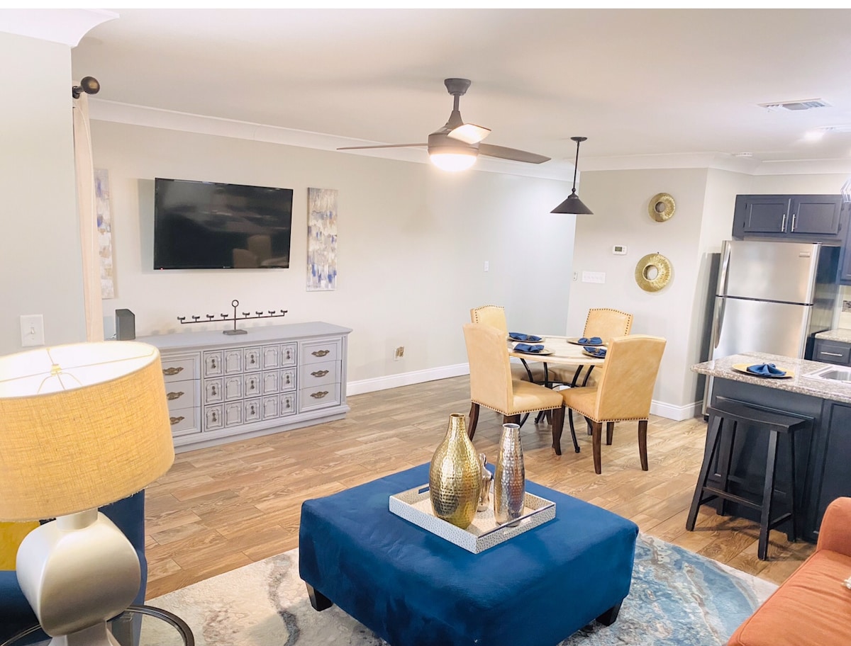 Classy & modern 1 bedroom condo located in the heart of Destin just minutes away from the beach and popular attractions. Functional space accommodating 2 adults with 1 king size bed in the master and a couch in the living room that transforms into a full-size bed. We offer high speed WiFi with two large smart TVs and a full contemporary kitchen for those that enjoy cooking. Relax and enjoy a walk around the lake or community and feed some turtles! Two- Level 2 Tesla EV chargers on site.