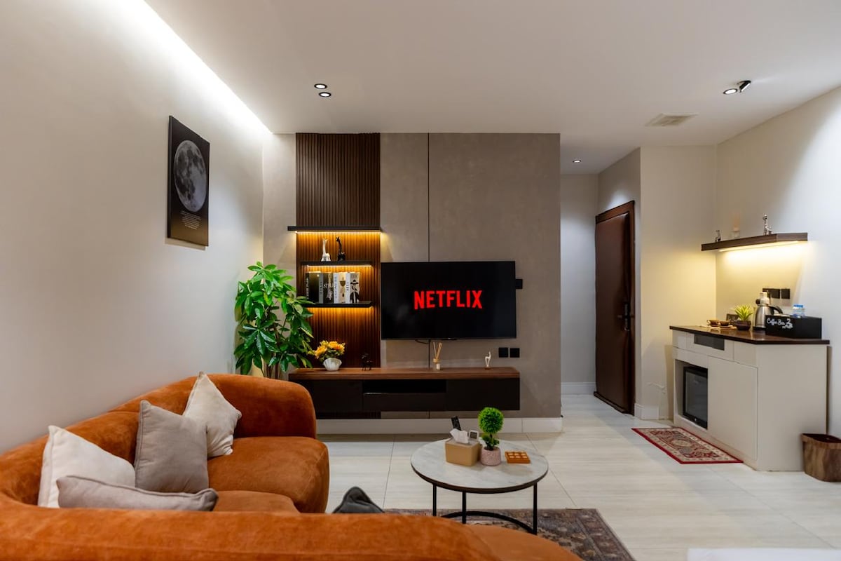 Elegante departamento con servicios de hotel disponibles - Servicio de hospitalidad: agrega té - café - azúcar - agua - Servicio de salud: shampoo - salper - jabón - - toallitas - caballeros y pasta - Servicio de internet gratuito. - Entrada autónoma - Estacionamiento privado - Cuenta de Shahid - Cocina pequeña . Cerca de supermercado, restaurante, café, lavandería, a pocos metros. Diriyah está a unos 8 km y el bulevar está a 10 km. La estación de metro 2A2 está a unos 14 minutos y la estación de autobuses Irqa 501 está a unos 10 minutos.