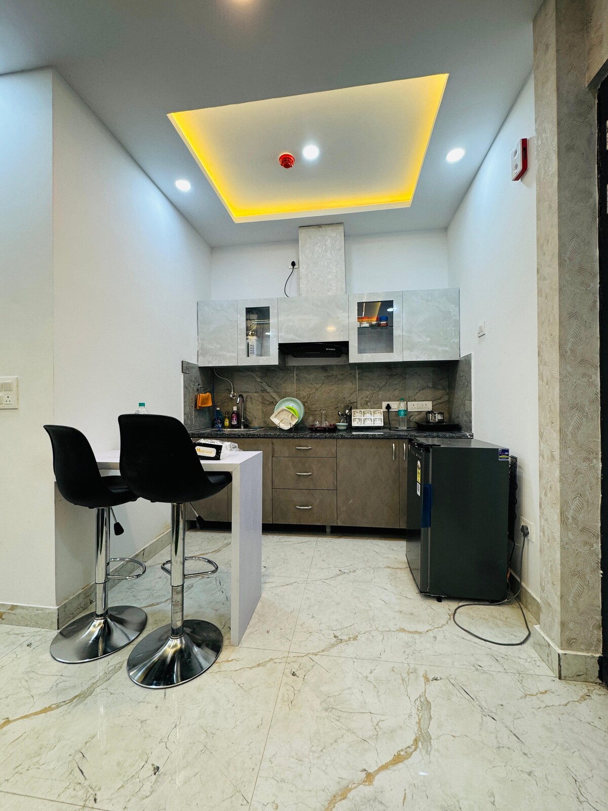 El primer apartamento de 2 Bhk que cumple con todos los requisitos ✨ - 2 dormitorios ( dormitorio principal, segundo dormitorio). - Dos camas tamaño king. - Una amplia sala de estar con una cómoda disposición de asientos. - 2 baños ( 1 en cada uno de los dormitorios). - Cocina pequeña (con todos los utensilios básicos de cocina disponibles y servicios abastecidos, es el lugar perfecto para preparar tus comidas favoritas) - Una zona de balcón compartido que conecta con el apartamento, que puede ser el espacio perfecto para tus paseos nocturnos. ¡Reserva ahora!