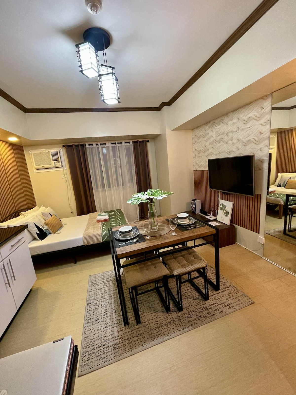 Te damos la bienvenida a Luxe Studio, donde el estilo se une a la comodidad Entra en un estudio elegante y cuidadosamente diseñado en el corazón de Davao, a solo unos pasos del centro comercial Abreeza. Ya sea que estés bebiendo vino en el bar, disfrutando de Netflix en el televisor inteligente o viendo las luces de la ciudad desde tu balcón privado, este espacio está diseñado para ayudarte a relajarte.