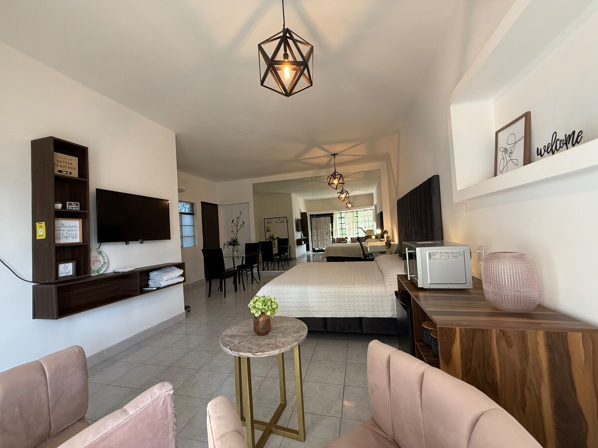 Cómodo y equipado loft hasta para 2 personas, pudieran ser 4 costo adicional. Ubicado en un fraccionamiento cerrado con entrada independiente a una casa que también es airbnb y espacio para estacionamiento privado. Su ubicación es inmejorable, cerca de vías rápidas y con acceso a solo unos pasos a: Starbucks, farmacia, banco y variedad de restaurantes. Equipado con cocineta, cafetera, licuadora de inmersión, microondas, barra, baño, closet, smart tv 40” minisplit frío/calor, burrito y plancha.