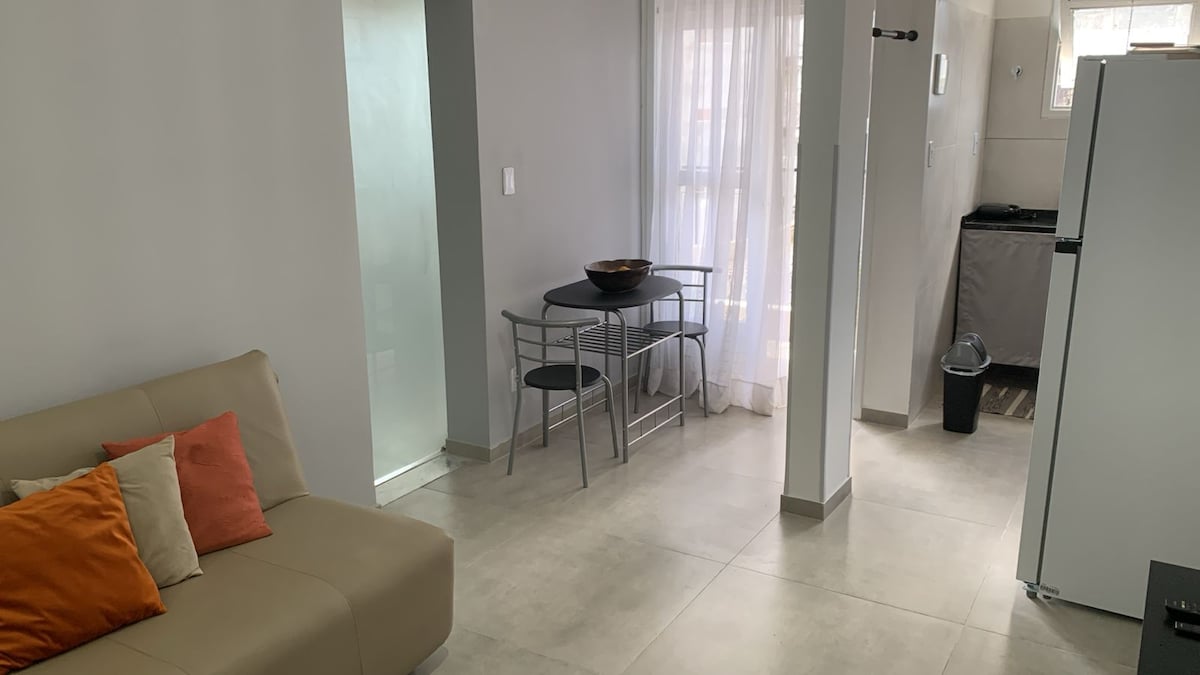 Espaço compacto e funcional Ideal para duas pessoas. Vcs dormirão numa cama queen size com colchão ortopédico, lençóis de algodão, terão ar condicionado split, cortinas blackout, smart tv de 43 polegadas, Wi-Fi, DVD e uma mini cozinha com frigobar, cafeteira, chaleira elétrica, filtro d’água, louça e talheres. Para hospedagem em nosso apartamento só aceitamos mínimo de duas diárias!