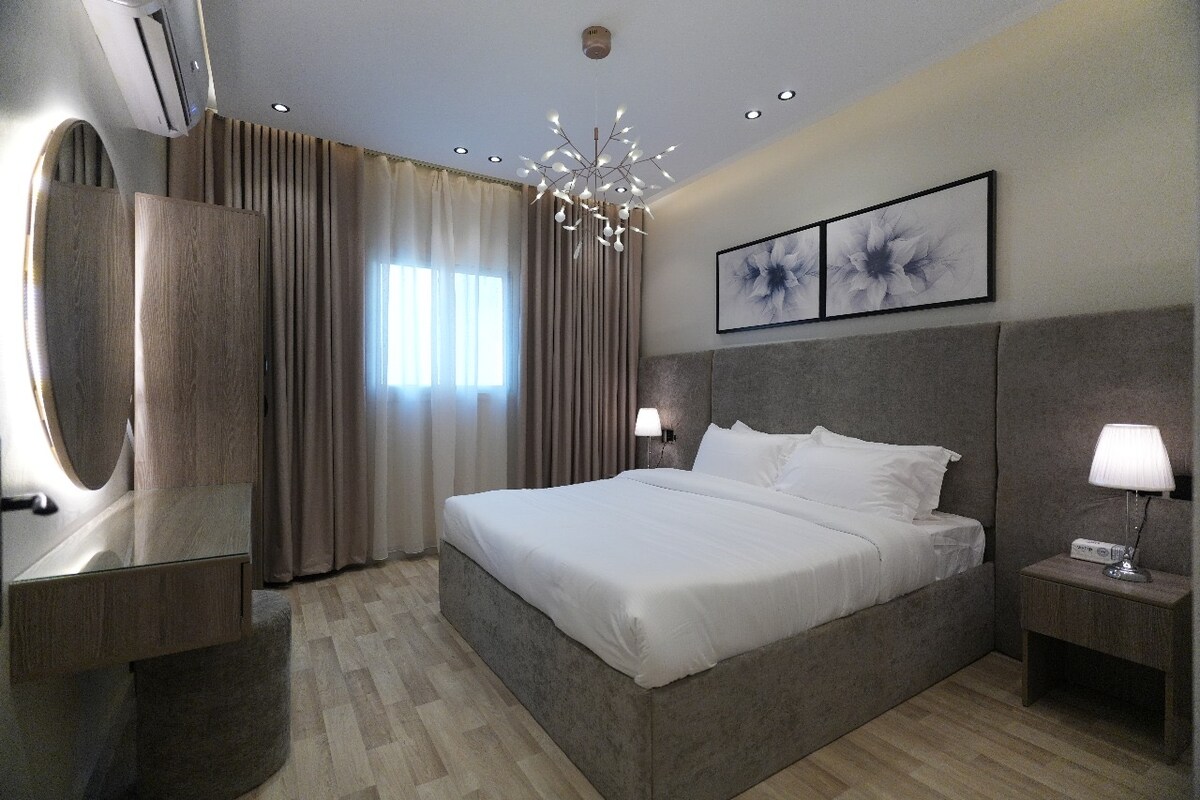 Un apartamento moderno diseñado para una estancia excepcional, situado en uno de los mejores barrios de Riad con unas vistas impresionantes de KAFD. Cuenta con una zona de estar al aire libre con pantalla y proyector para disfrutar de las noches. Para tu comodidad, la cama incluye una capa adicional de 14 cm de alta calidad. «También ofrecemos servicios de coordinación de eventos para ocasiones especiales (incluyendo pasteles y accesorios) por una tarifa adicional con reserva previa, lo que garantiza una experiencia inolvidable»