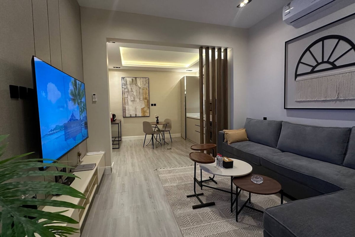 El apartamento de lujo incluye: - 1 dormitorio espacioso con cama tamaño king. - 1 baño completo, lavadora. - 1 salón/cocina Nos complace ofrecer un check-in anticipado o un check-out después de la hora establecida en el plazo de 1 hora (si no hay huéspedes antes o después) sin cargo adicional. Para más de 1 hora, se aplica una tarifa de servicio exprés de 150 SAR para ajustar la limpieza y la programación. Tarifa por fumar: 1000SR Tarifa por salida después de la hora establecida: 300SR