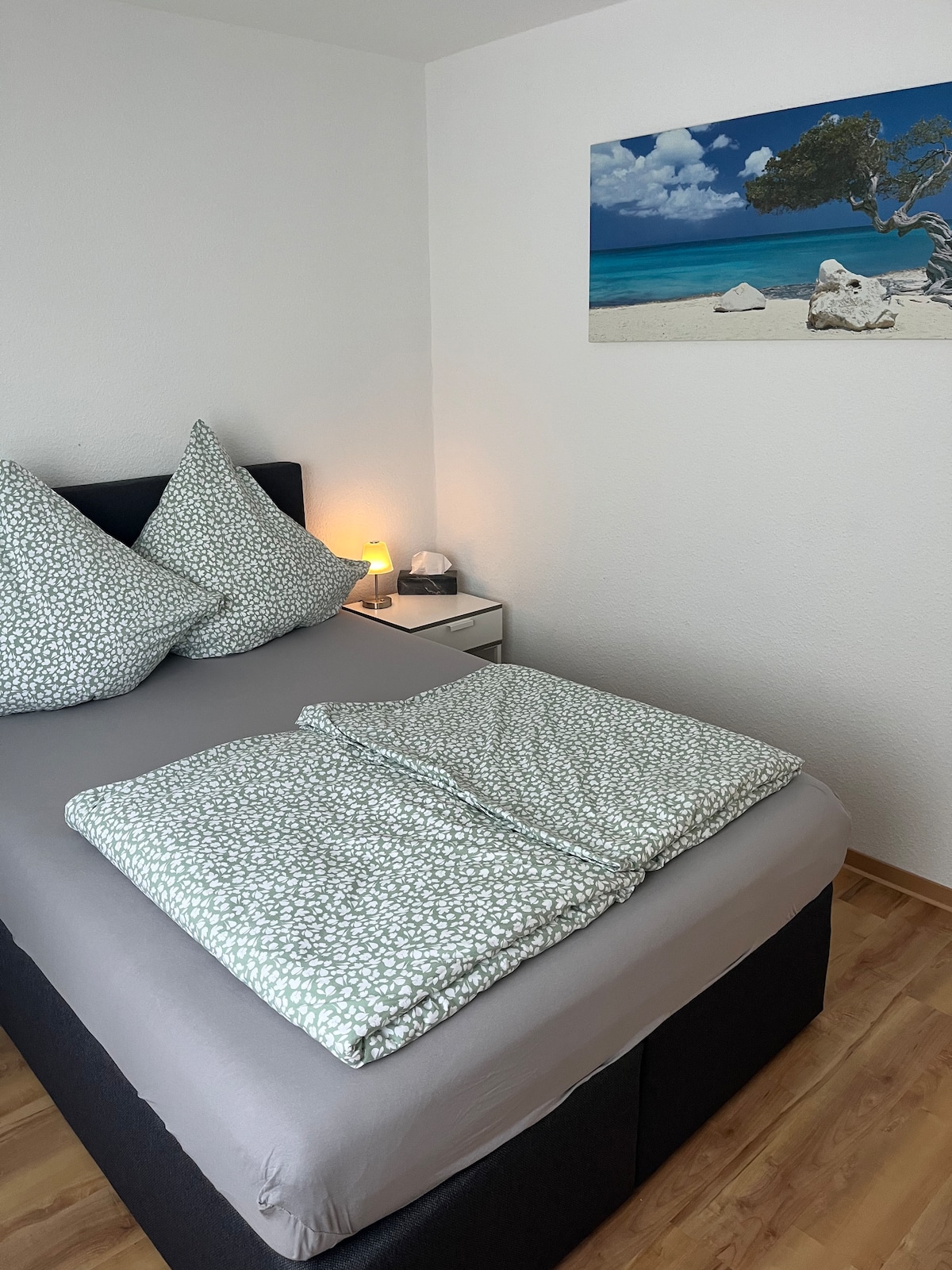 Komplette, moderne, stilvolle 48m² 1-Zimmer-Wohnung mit Arbeitsplatz. Wohn-/Schlafbereich mit modernem, bequemen Schlafsofa mit 1,40x2,00 m Schlaffläche plus extra Topper für bequemes Schlafen. Zentrale Lage in sehr ruhiger Nebenstraße. Wohnküche mit Herd, Backofen, Mikrowelle, Kaffeemaschine, Wasserkocher, Kühlschrank und wunderschönem Massivholz-Hochtisch mit zwei Hockern. Großzügiges Bad mit extra großer Dusche, Waschbecken, WC. Ausgestattet mit Fön. Bei Extra-Wünschen gerne fragen.