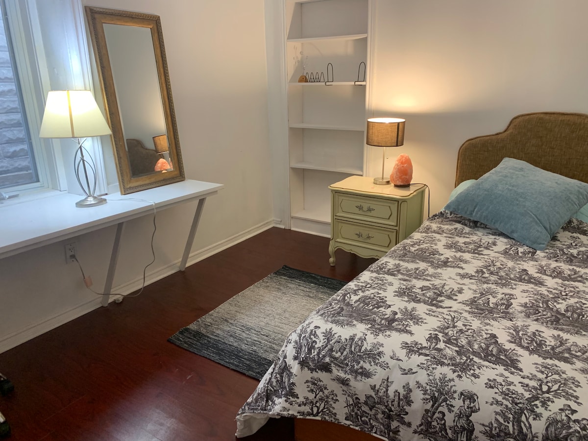 Tenemos una casa recién renovada en Leaside con una habitación privada grande y baño privado. Las comodidades incluyen comedor en la habitación, rincón de té y café, refrigerador, televisor de 50" con Netflix y Amazon Prime. La casa está cerca del transporte público (autobuses directos al metro), el Hospital Sunnybrook, el Centro de Ciencias de Ontario y el Jardín Botánico y Centro de Conferencias de Toronto.