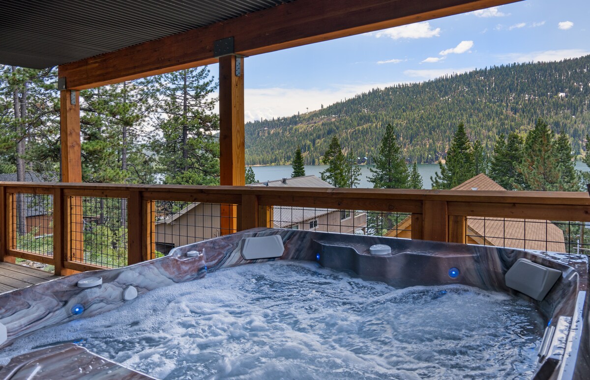 Featured by Dwell Magazine and Interior Design Magazine! Our home has great views of Donner Lake throughout the house, a large sundeck, private lake view hot tub, and a real wood fireplace. Live in luxury with high-end finishes like Kitchen-Aid and Miele appliances, en suite bathrooms, heated bathroom floors, media room with 65-inch OLED TV and Sonos Arc Soundbar, and gigabit WiFi. Eco friendly features include solar panels, 12-hour whole home battery backup, and L2 EV charger.