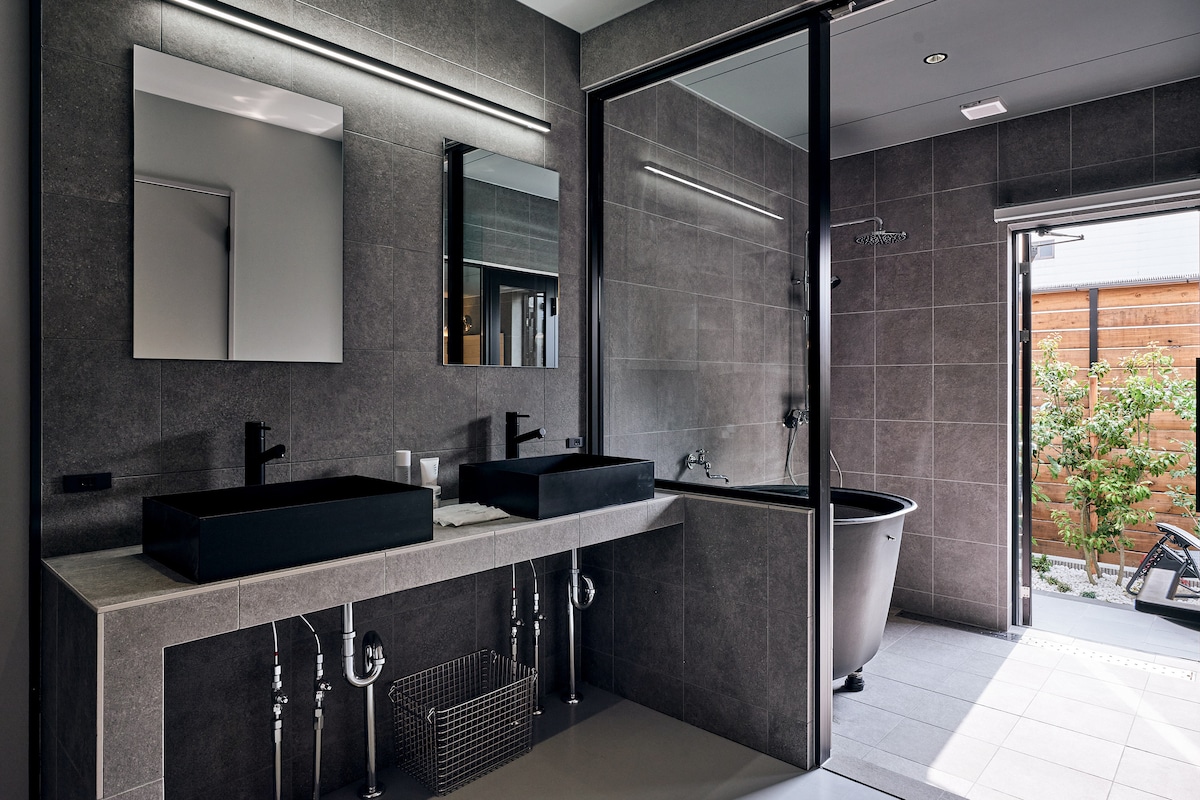 Renovada en agosto de 2025, es una casa completa que combina el estilo japonés con comodidades modernas. Esta espaciosa propiedad, con una superficie total de 144 m², cuenta con una sala de estar y comedor de planta abierta, una habitación de estilo occidental con cama doble y una habitación de estilo japonés con tatami y cama tamaño queen, ambas impregnadas de un agradable aroma, lo que las convierte en un espacio relajante para que disfrute en familia o con amigos.El baño ofrece la lujosa experiencia de sumergirse en agua caliente mientras se contempla el jardín del patio.También hay una ducha separada del baño y dos inodoros.También es cómodo para una estancia de dos familias.El papel tapiz es de papel Tosa washi con carbón Binchotan, y los delicados paneles shōji te permiten disfrutar de un espacio de estilo japonés con una luz suave y sutiles contrastes entre la luz y la sombra.Con la caligrafía «Kawa» (río) del artista Wataru Hatano colgada sobre la chimenea, este es un alojamiento lujoso y auténticamente japonés.Puedes relajarte en la sauna, charlar junto a la chimenea en invierno y divertirte con el karaoke.También hay estacionamiento privado disponible, lo que combina comodidad y confort.Además, ofrecemos un set de matcha de la casa de té Ippodo, de 300 años de antigüedad, en Kioto, donde podrás disfrutar de la cultura japonesa.Se encuentra a 6 minutos a pie de la estación de Miyakojima y a 6 minutos de la estación de Osaka, por lo que es un punto de partida ideal para hacer turismo.