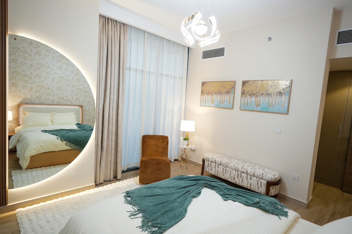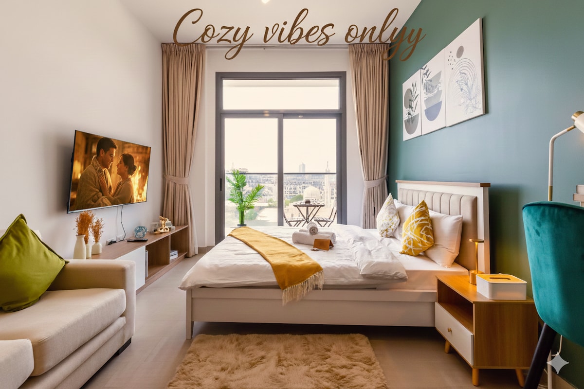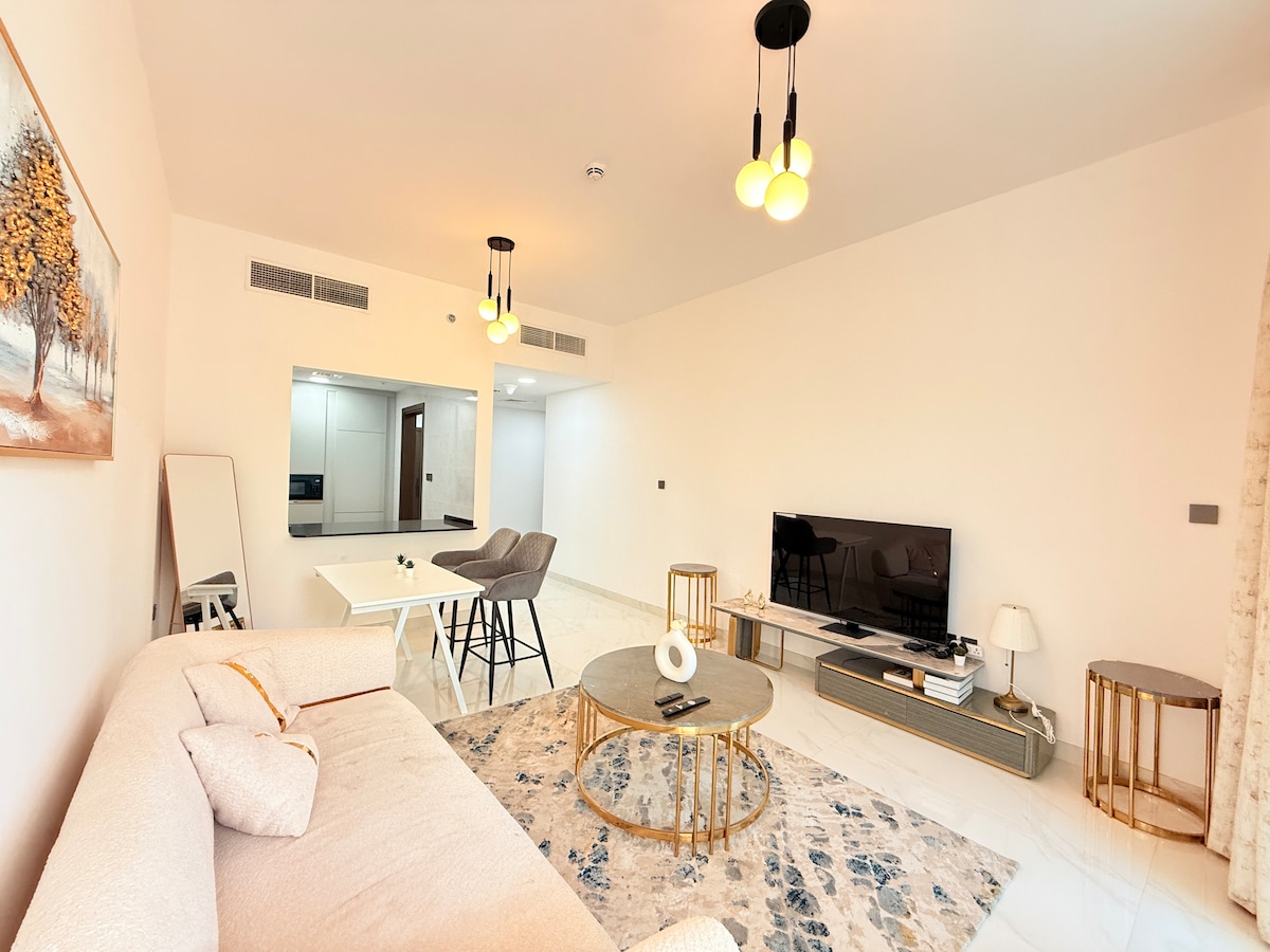 Bienvenido a tu luminoso y moderno apartamento de 1 dormitorio en el corazón de Jumeirah Village Circle, perfecto para parejas, viajeros solitarios, huéspedes de negocios e incluso familias pequeñas. Amueblada con esmero y llena de luz natural, esta casa ofrece todo lo que necesitas para disfrutar de una estancia cómoda y relajante. Ya sea que estés de visita por unos días o planeando una estadía más larga, te sentirás como en casa. Relájate en este espacio tranquilo y elegante.