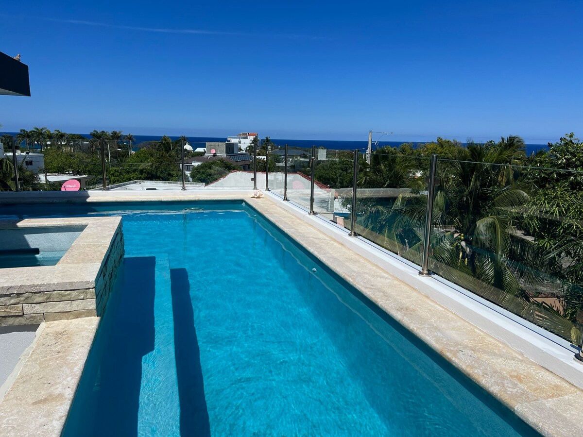 Amplio condominio con amplia sala de estar interior con sofá cama, mesa de comedor para 4 personas y cocina bien equipada. Balcones con mesa de comedor para 6 personas, 2 tumbonas y un segundo balcón sombreado con 2 sillas y una mesa pequeña. Habitation con cama king y cortinas blackout y abanico. El condominio está ubicado en lo más alto, lo que lo hace muy privado y tiene una vista de 180 grados del exuberante jardín tropical y el Océano Atlántico. Gran piscina comunitaria y seguridad 24h.