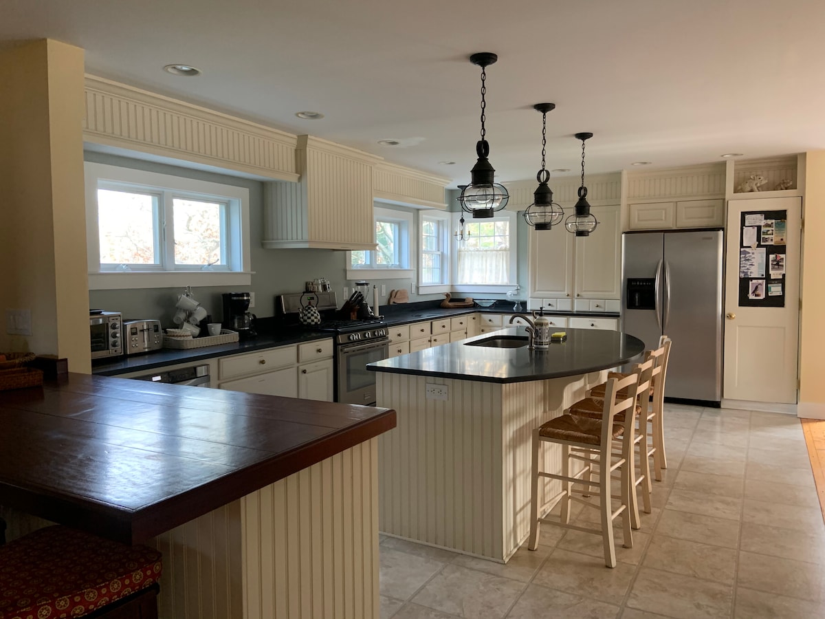 ¡RESERVA GRATIS PARA AGOSTO 22-29! En el pueblo, casa de campo de los años 30, cuidadosamente actualizada por el arquitecto-propietario. • Decoración elegante, plano de piso abierto, terraza de granito • A 2 cuadras de la calle principal/puerto/ferry/playa de la ciudad/casa de juegos. • Central Air • Cerca de alquiler de bicicletas, restaurantes, tiendas, spa, biblioteca, minigolf, etc. • Gran patio con parrillas de madera/gas, bochas, agujero de maíz, sillas de playa, fogata • Ducha exterior • Loft de 3 dormitorios +