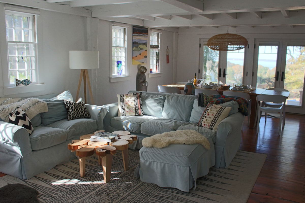 Casa rústica de estilo granero, vista al agua, amplio paisaje natural, serenidad y privacidad en 3 acres ubicados en el centro a 1 milla de los centros de Oak Bluffs y Vineyard Haven. A pie de la playa, carril bici cercano, interiores cómodos, colchones de espuma viscoelástica, sábanas de algodón, 2 televisores de alta definición, wifi de alta velocidad, calefacción/aire acondicionado, 2 kayaks oceánicos y 2 bicicletas. La ubicación, los servicios y la privacidad rodeados de belleza natural hacen que alojarse sea muy fácil y relajante. Pregúntale al anfitrión sobre las reservaciones de ferris si parecen agotarse.