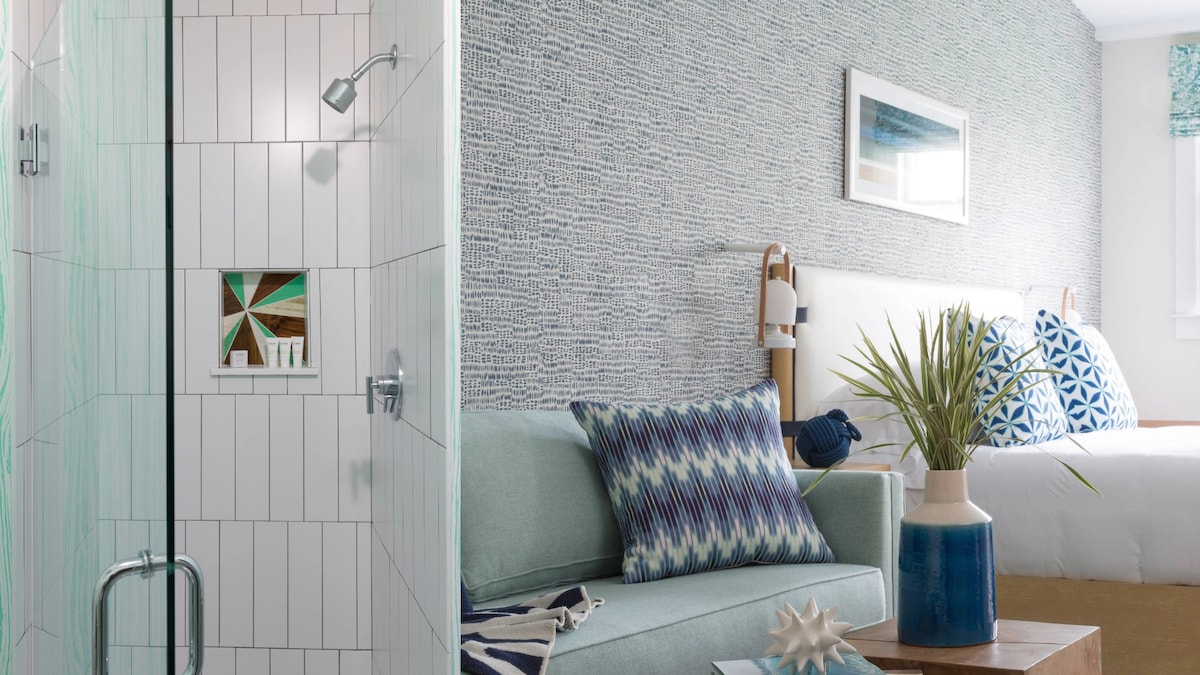 Alójate en nuestras acogedoras suites Village King, aptas para perros, cerca de Jones Pond, detrás de nuestra posada Falmouth MA. Cada suite de 375 pies cuadrados cuenta con un dormitorio king separado, sala de estar, ducha a ras de suelo y comodidades modernas como dos televisores inteligentes, mininevera y wifi gratuito. Tiene capacidad para tres personas con una cama plegable. ¡Perfecto para huéspedes que viajan con mascotas!