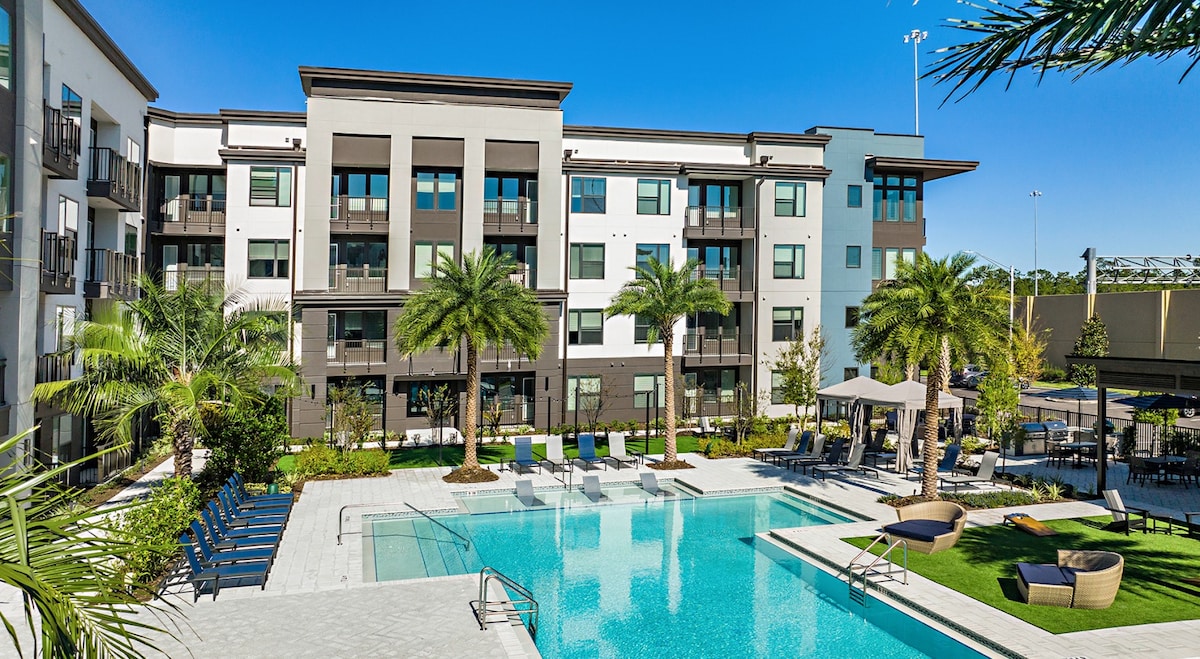 Disfruta de la comodidad de un departamento espacioso y de lujo diseñado solo para ti. Con dos grandes suites principales, camas tamaño king y baños privados, tendrás todo el espacio que necesitas para relajarte y recargarte. Puedes descansar junto a la piscina estilo resort, mantenerte activo en el gimnasio de última generación o explorar tiendas y restaurantes cercanos en el centro de la ciudad. Estás a solo 15 minutos de la playa y cerca de la Clínica Mayo. Con fácil acceso a la I-295, te encantará lo conveniente que es todo a tu alrededor en esta ubicación privilegiada.