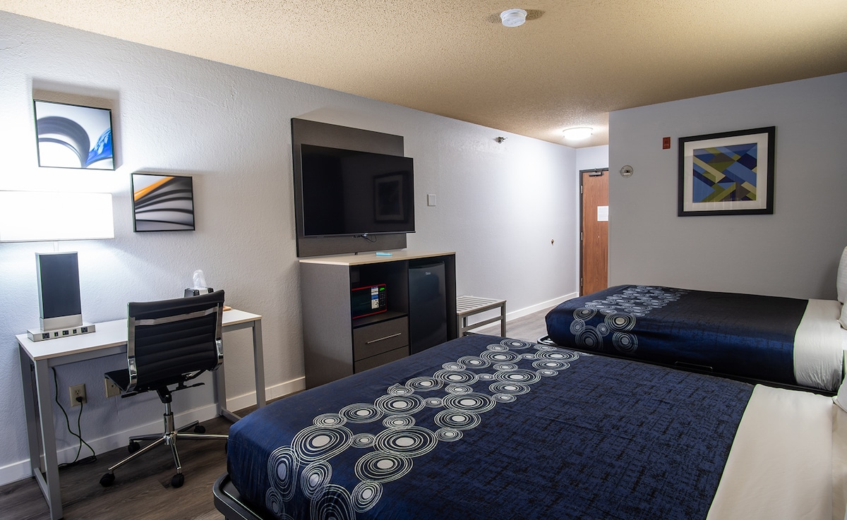 Dual queen suite with access to pool, hot tub, sauna, gym, lounges, and outdoor lounge space. Just minutes from Mall of America, MSP Airport, and the light rail to downtown. Features two plush queen beds, work desk, and kitchenette with mini-fridge, microwave, and coffee maker. Enjoy free airport shuttle, on-site dining, and all the amenities for a relaxing and convenient stay.